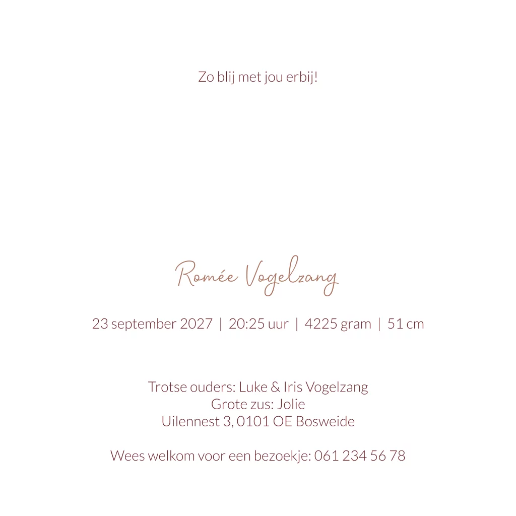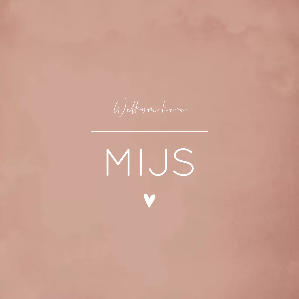 Roze geboorte kaartje met een illustratie van een hartje. Aan de binnenkant van geboortekaartje Mijs zie twee zusjes. Pas het kaartje naar eigens wens aan in de editor. Tip van de maker: laat dit geboortekaartje bedrukken met koperfolie.
