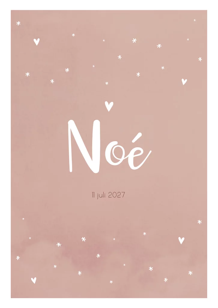 Een romantisch geboortekaartje met een roze gewolkte achtergrond en een witte omranding. Op kaartje Noé zijn hartjes en sterretjes op de kaart geplaatst voor een lieve uitstraling. Wil je graag iets aanpassen? Neem dan een kijkje in onze editor voor alle mogelijkheden!