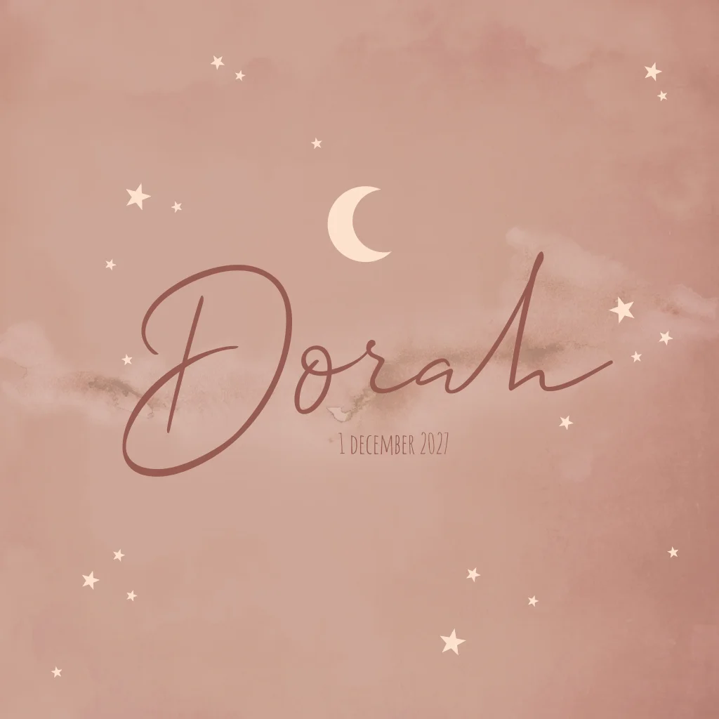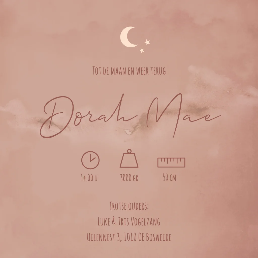 Roze geboortekaartje met wolkjes, sterretjes en maantjes. Geboortekaartje Dorah is een romantisch geboortekaartje in het thema heelal.