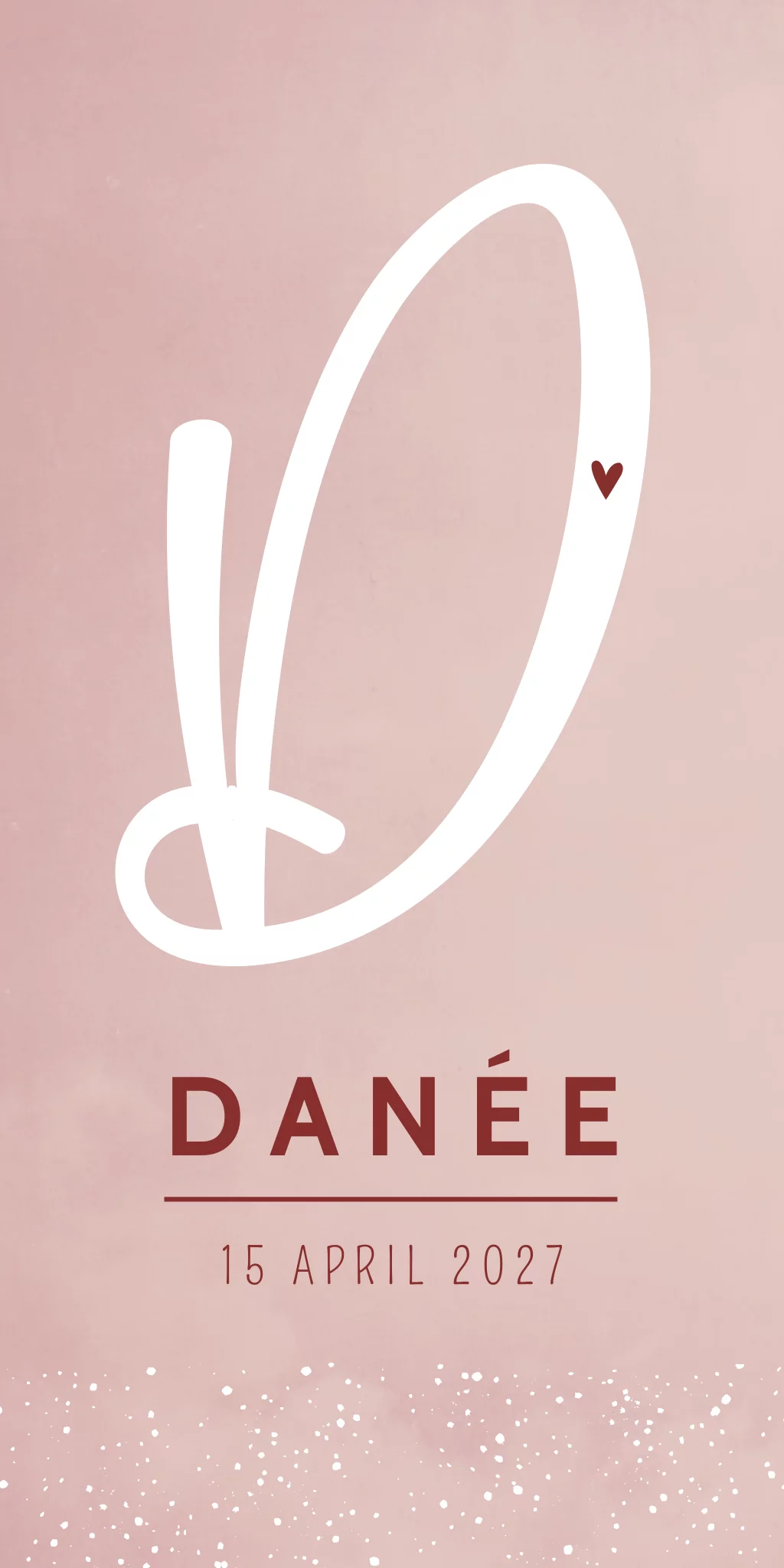 Een roze gewolkt geboortekaartje met een grote sierlijke letter op de voorzijde van de kaart. Op kaartje Danée is een sierlijk lettertype gecombineerd met een strak en modern lettertype. Zo krijg je een bijzonder kaartje!
