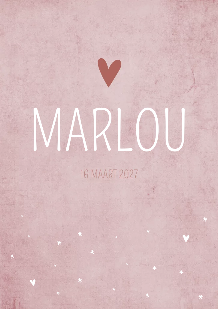 Lief en zacht geboortekaartje Marlou in roze gewolkte kleur. De hartjes en sterretjes in koperfolie maken het kaartje helemaal af. Wil je liever geen folie op kaartje Manou? Dan kun je het gemakkelijk aanpassen naar een andere kleur. Je maakt het helemaal zelf in onze editor!