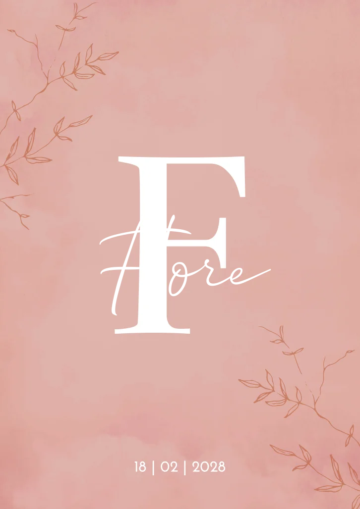 Een warm roze geboortekaartje met een grote letter als initiaal op de kaart. De speelse takjes maken het kaartje net wat sierlijker. Kaartje Flore is een modern en strakke kaart. Door de naam in koperfolie te drukken springt deze er extra uit! Wil je hem liever aanpassen qua kleur of opmaak? Dit doe je binnen enkele minuten in onze editor!