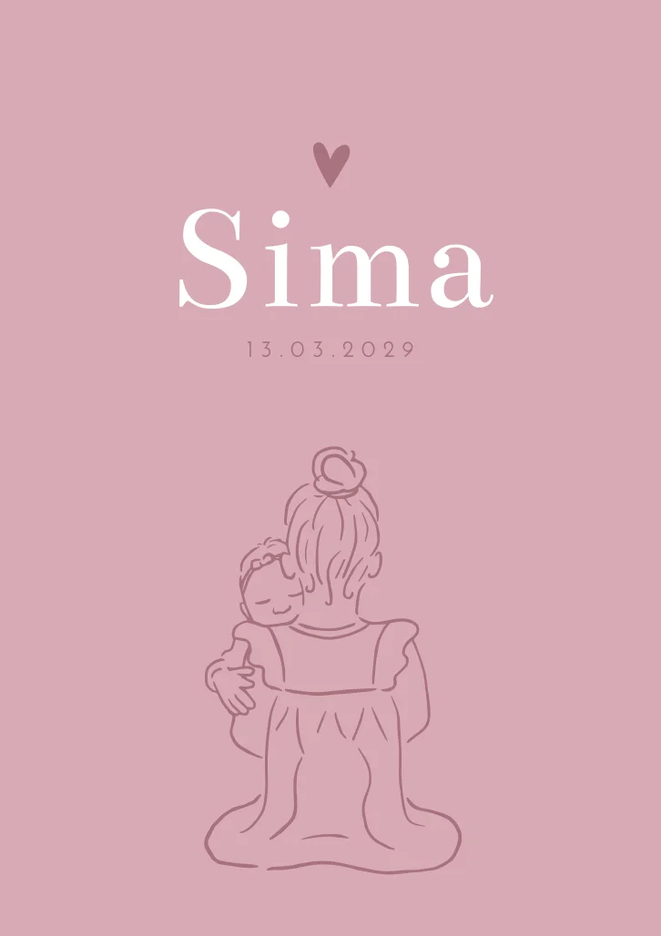 Een zoet roze geboortekaartje met daarop een lijntekening van een grote zus die haar baby zusje vasthoud. Ziet jouw gezin er anders uit? In onze beeldbank vind je heel veel verschillende lijntekeningen van broers en zussen.