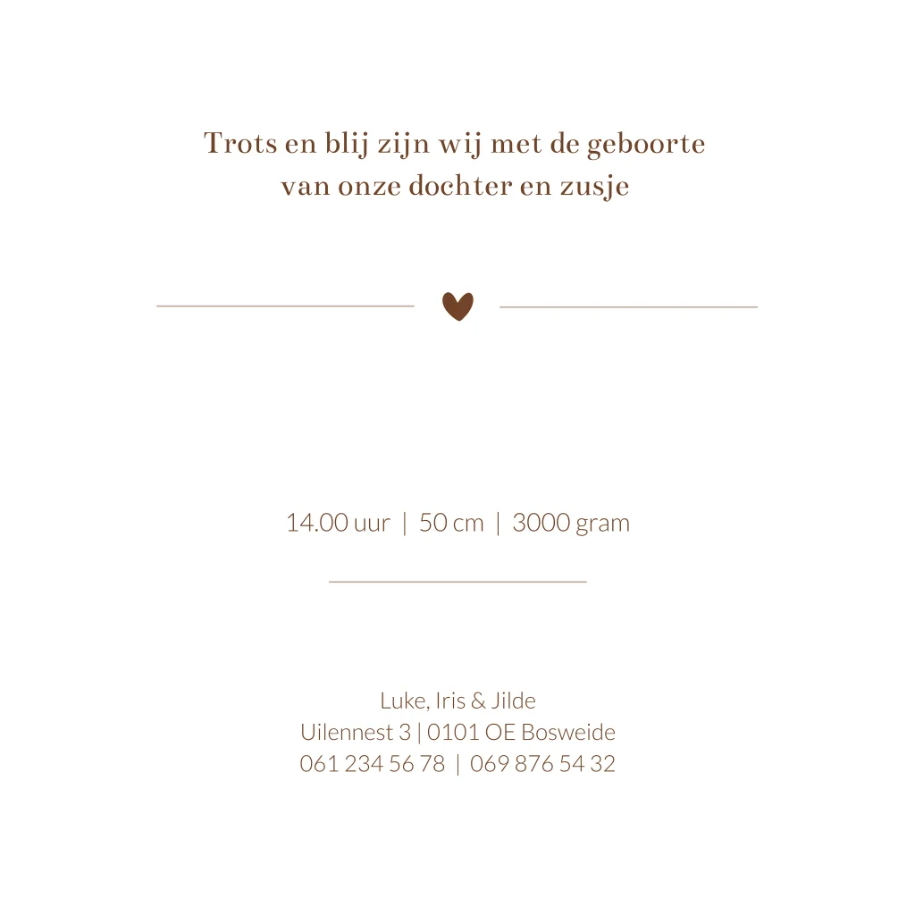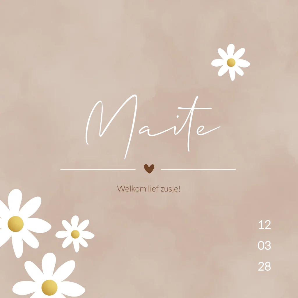 Een romantisch roze bloemenkaart met een illustratie van madeliefjes en aan de binnenzijde twee zusjes. Wil je graag een andere illustratie op kaartje Maite? Kijk dan even rond in onze beeldbank op de editor.