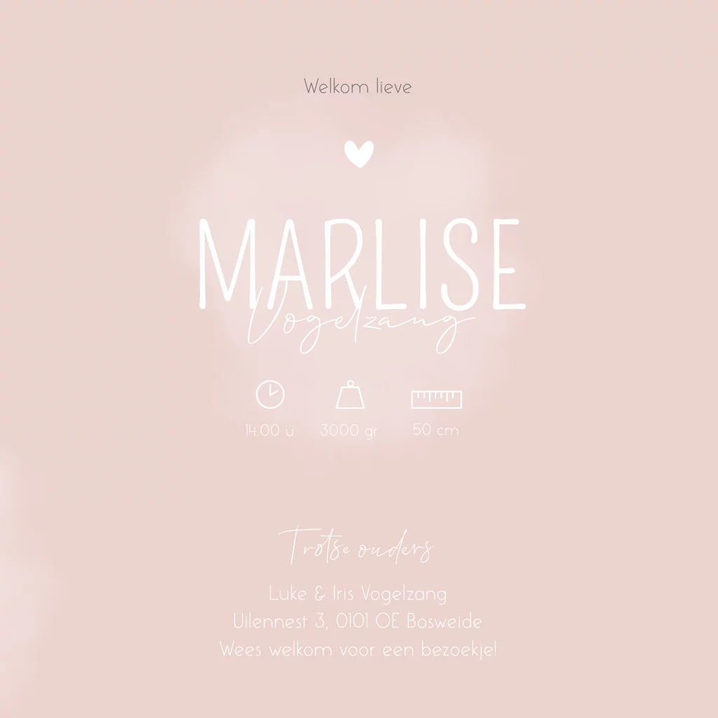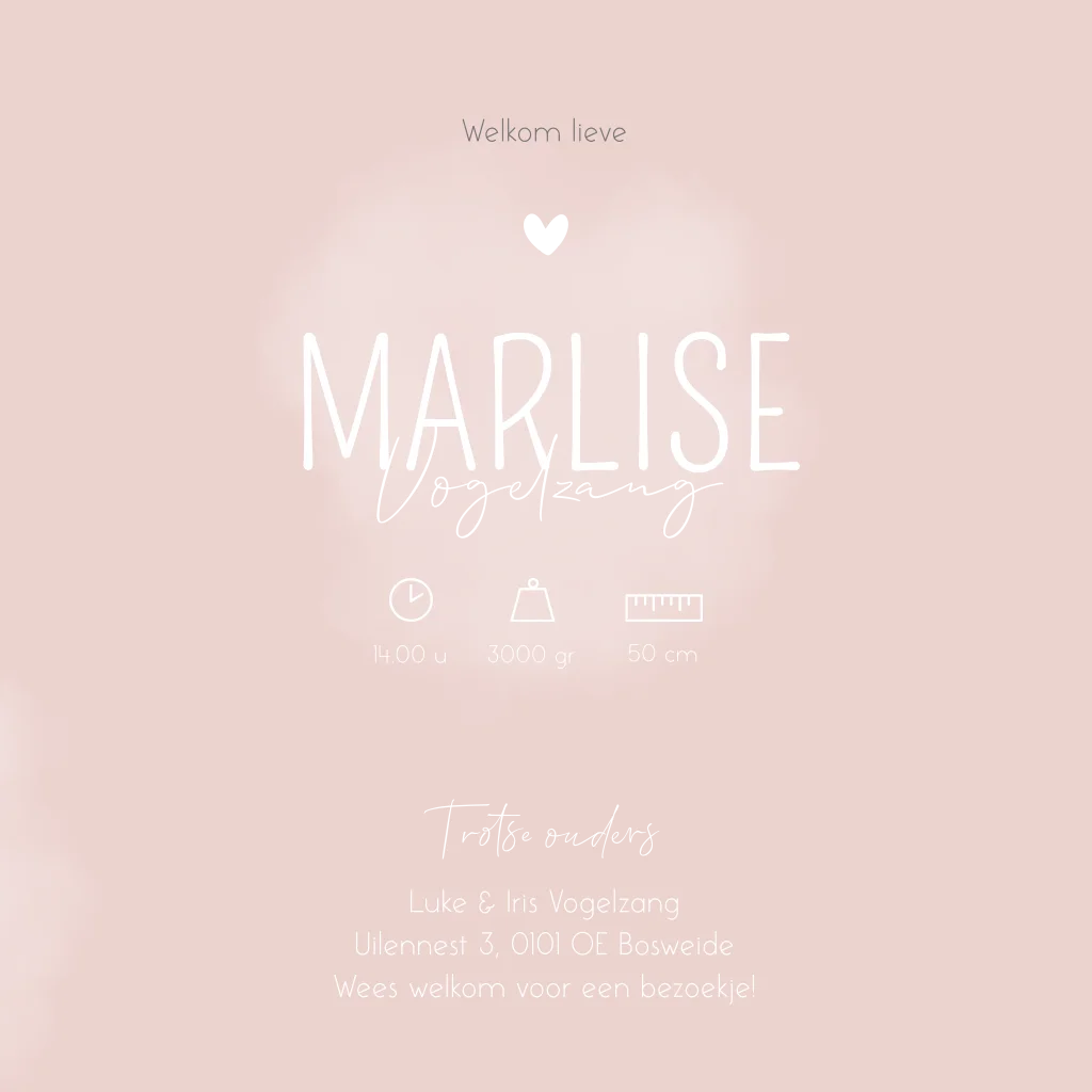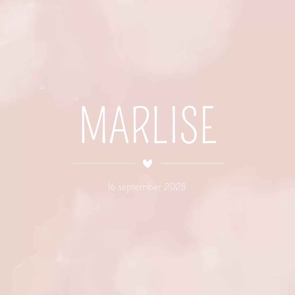 Een trendy en stijlvol tijdloos hip geboortekaartje in zacht rozel kleur met koperfolie letters. De kaart is dromerig met de wolkjes. Babykaartje Marlise kun je eenvoudig aanpassen van kleur en/of opmaak.