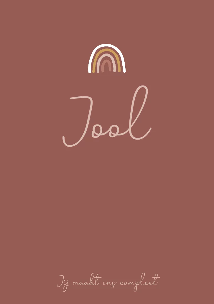 Een roze geboortekaartje met een regenboog op de kaart. Kaartje Jool heeft aan de achterzijde een lichtroze kleur. Wil je graag iets aanpassen? Neem dan een kijkje in onze editor.