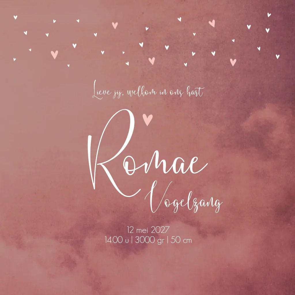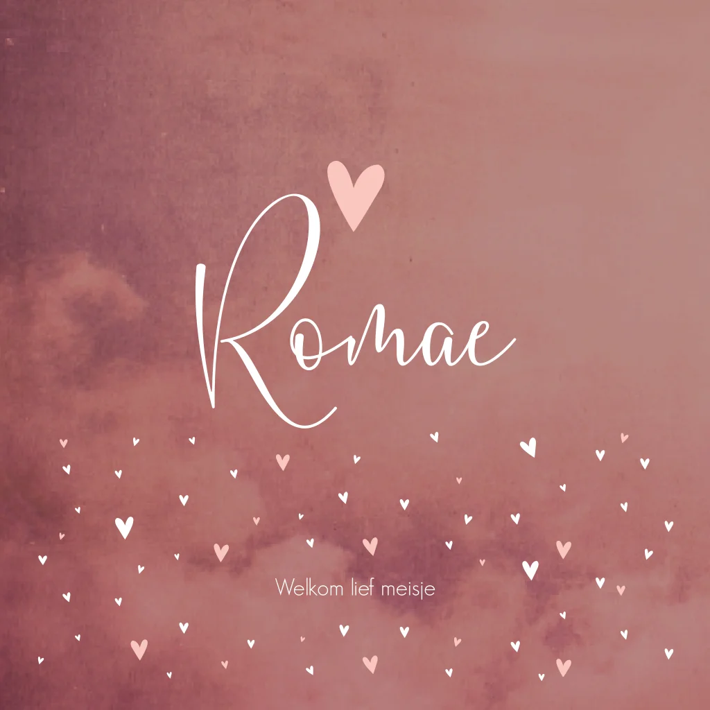 Romantisch en lief roze/ paars gewolkt geboortekaartje Romae gevuld met roze en witte hartjes. De sierlijke letters van de naam kun je ook aanpassen naar een ander lettertype. Wil je de kaart liever in een ander formaat hebben? Dit kun je makkelijk zelf doen binnen enkele seconden. Tip: laat de kaart matchen met de stijl en kleuren van de babykamer, zodat alles een mooi geheel wordt!