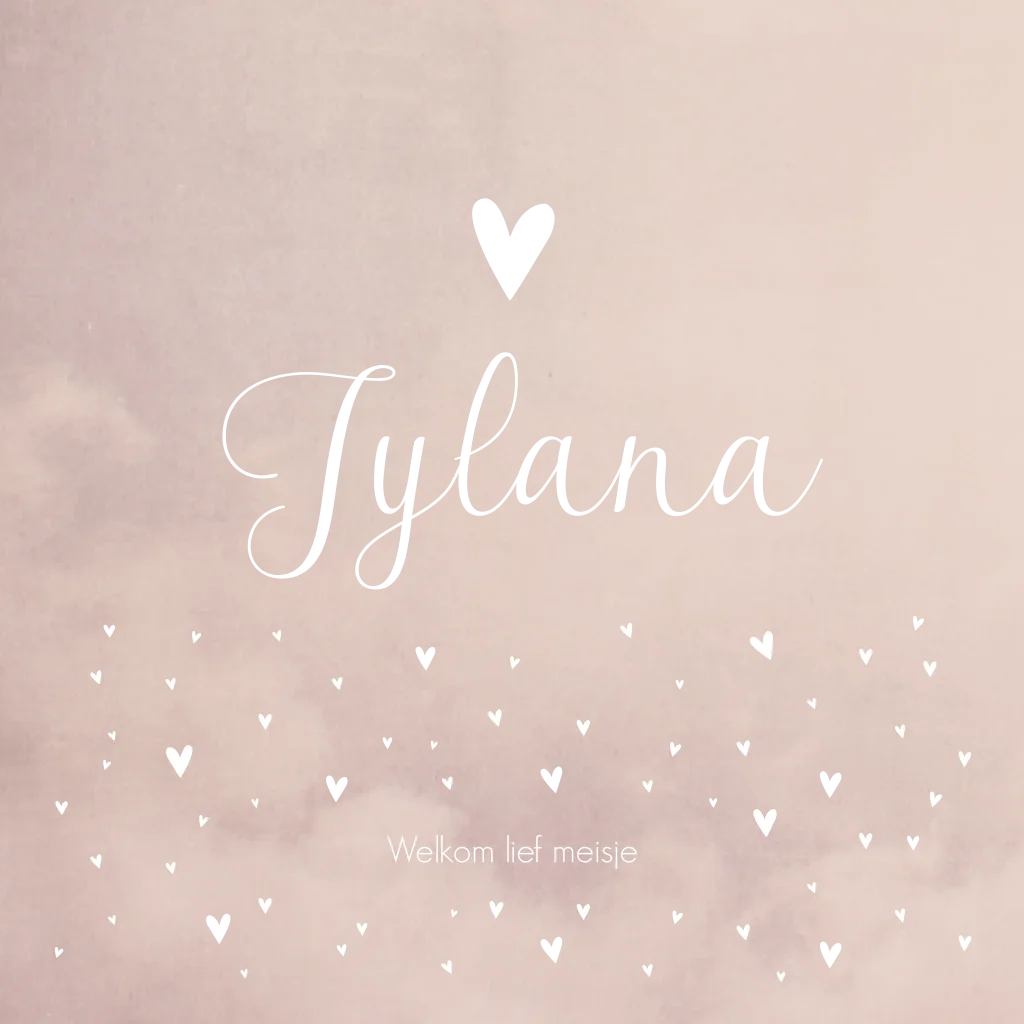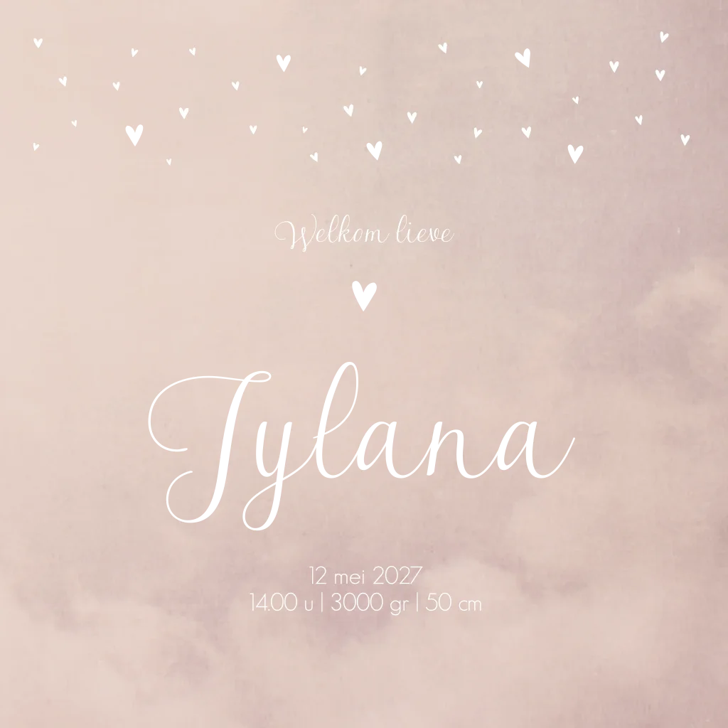 Romantisch en lief zacht oudroze gewolkt geboortekaartje Jylana gevuld met roséfolie en witte hartjes. De sierlijke letters van de naam kun je ook aanpassen naar een ander lettertype. De naam is nu te zien in roséfolie. Wil je de kaart liever in een ander formaat hebben? Dit kun je makkelijk zelf doen binnen enkele seconden. Tip: laat de kaart matchen met de stijl en kleuren van de babykamer, zodat alles een mooi geheel wordt!