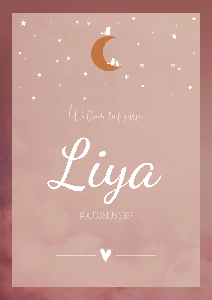 Een lief roze gewolkt geboortekaartje met koperen sterretjes, hartjes en naam. Het kaartje heeft een donker roze omranding. Wil je kaartje Liya aanpassen naar jouw wensen? Pas het kaartje dan gemakkelijk zelf aan in onze editor!