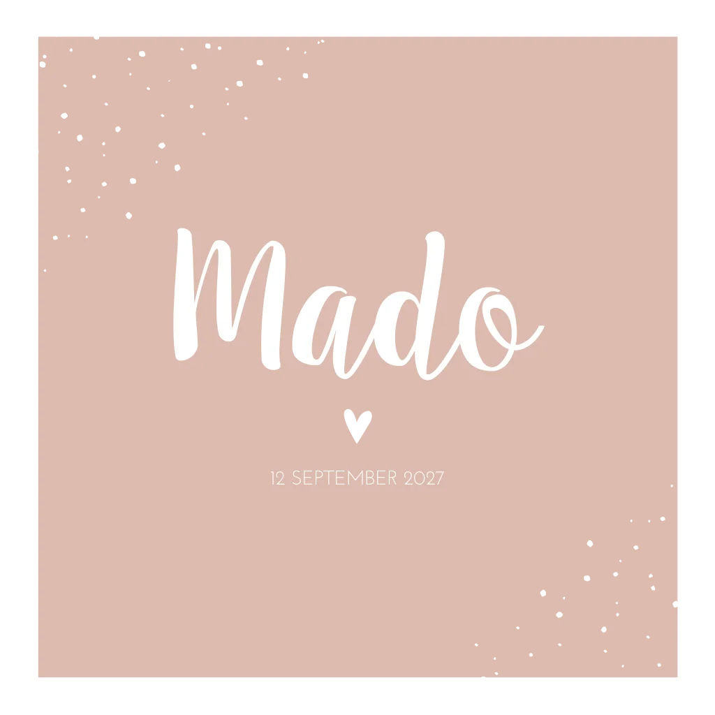 Een roze geboortekaartje met wit kader. In elke hoek zijn koperfolie stipjes. Kaartje Mado is een stoer kaartje.