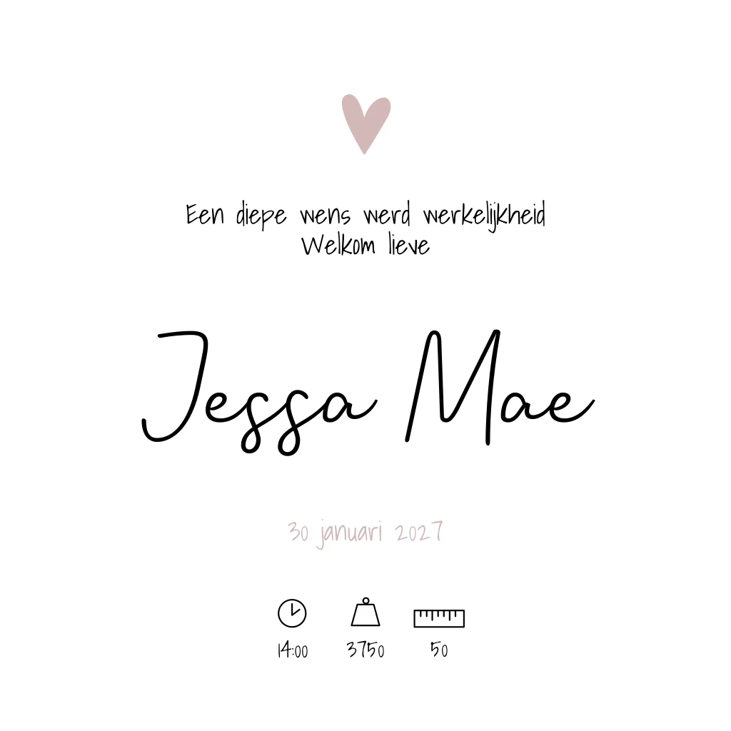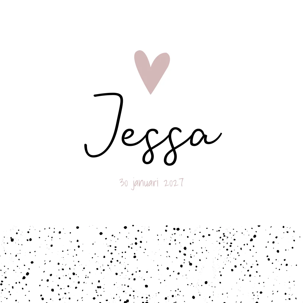 Een wit geboortekaartje met zwarte stipjes en roze hartjes. De roze kleur geeft kaartje Jessa een lieve uitstraling maar de stippen maken het geheel weer wat stoerder. Een perfecte combi!