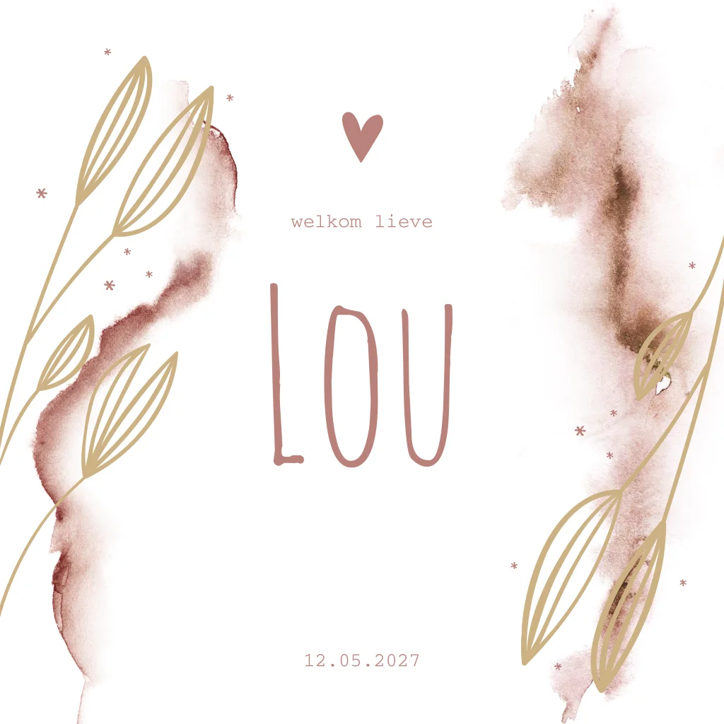 Een romantisch geboortekaartje met roze waterverf strepen. Kaartje Lou wordt aangevuld met sterretjes en takjes waardoor het een mooi romantisch kaartje wordt.