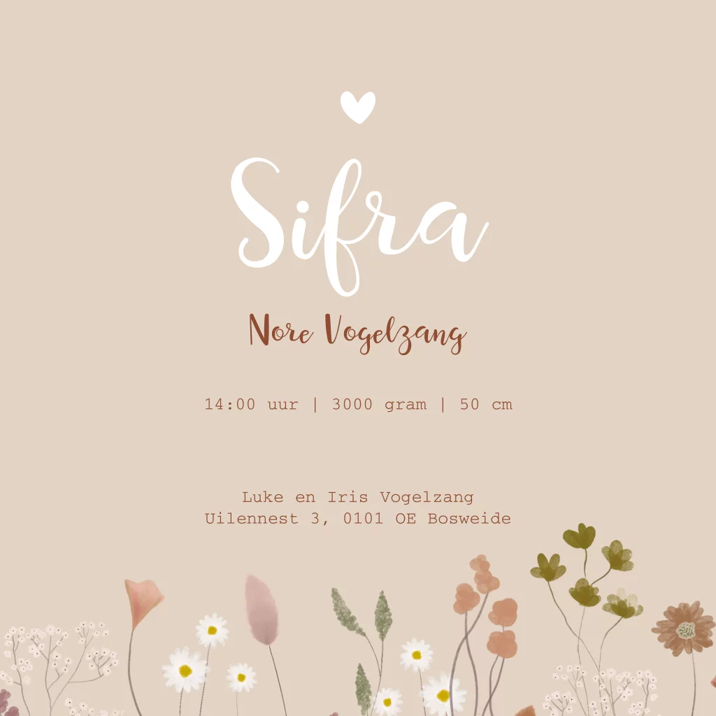 Een lief geboortekaartje met een getekend bloemenveld met droogbloemen. Kaartje Sifra oogt daardoor erg zacht maar toch vrolijk.