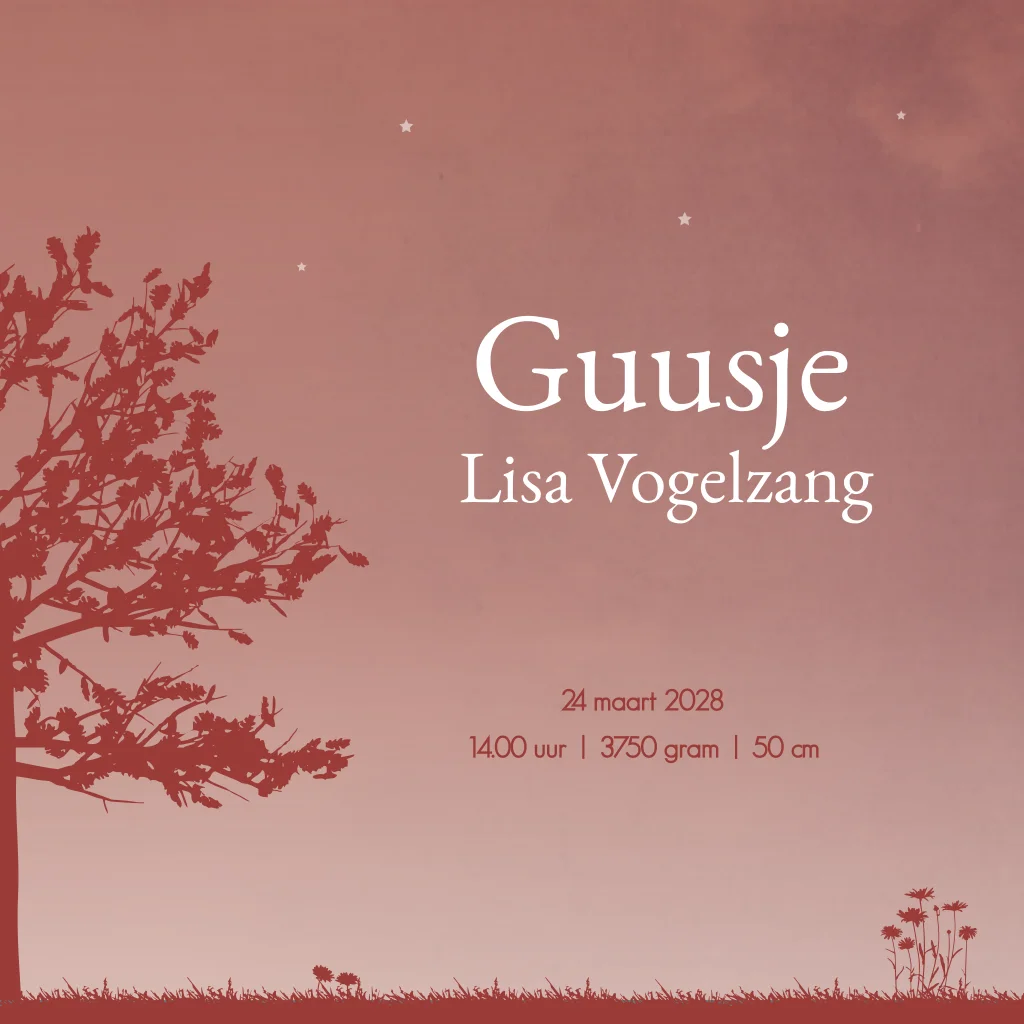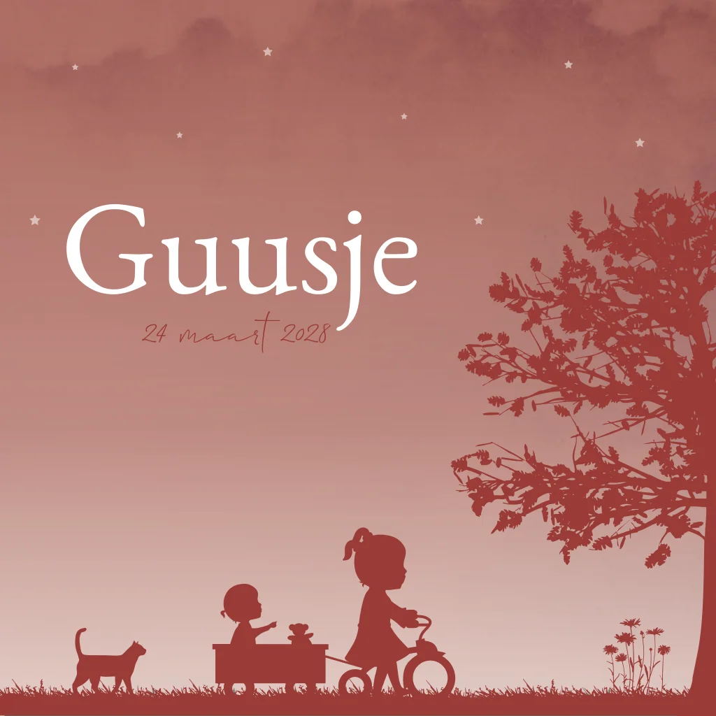 Een bordeaux rood silhouet geboortekaartje met een illustratie van een meisje op haar fiets met een bakje er achteraan waar haar kleine zusje in zit met een teddy beertje. Het poesje loopt ze achterna. Kaartje Guusje is een lief en stoer kaartje. Wil je liever een andere illustratie? Neem dan een kijkje voor al onze opties in de editor!