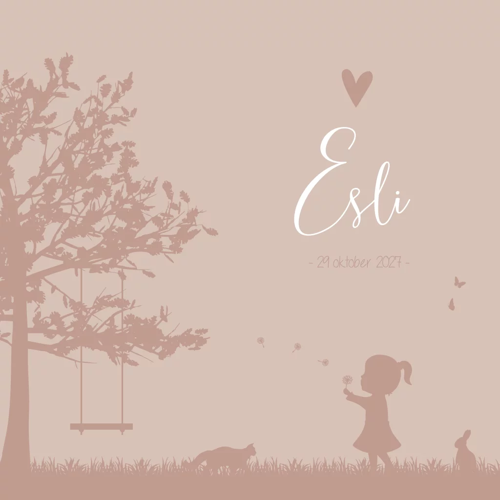 Een roze geboortekaartje met een meisje dat een paardenbloem wegblaast. Ze wordt omringt door verschillende dieren. Geboortekaartje Esli is een silhouet-illustratie kaartje waarbij je de illustraties eenvoudig zelf kunt aanpassen in de editor zodat het past bij jouw gezinssituatie.