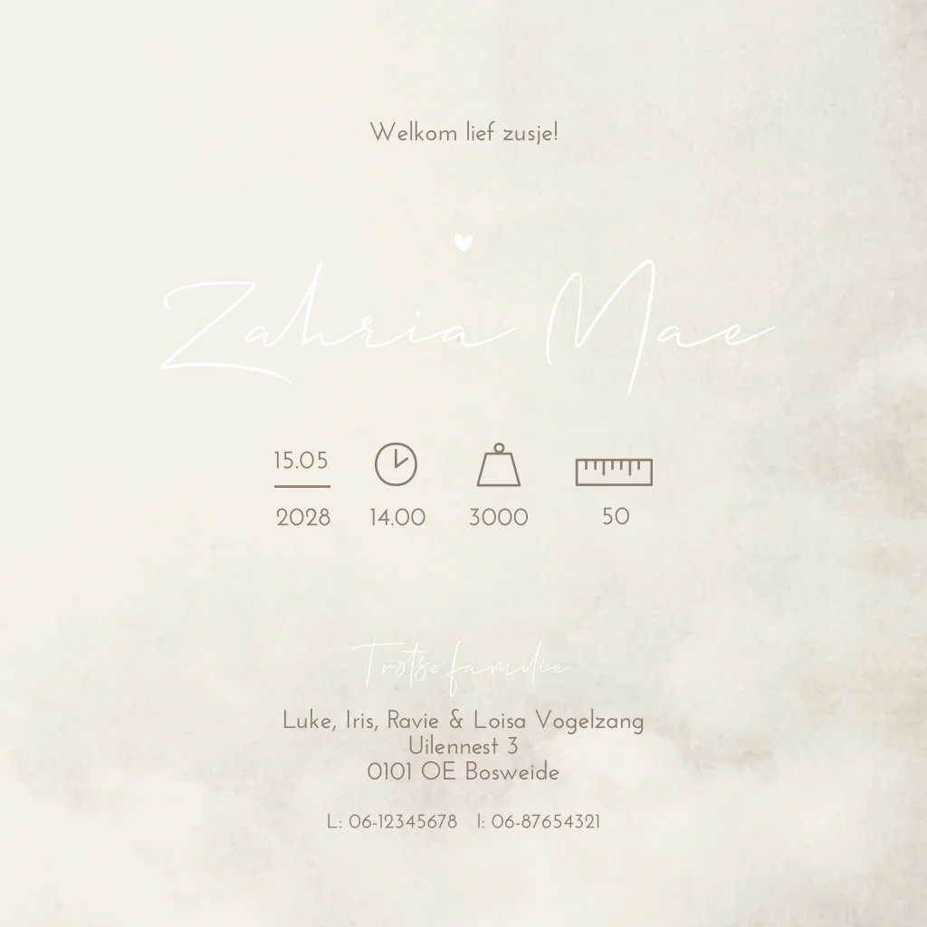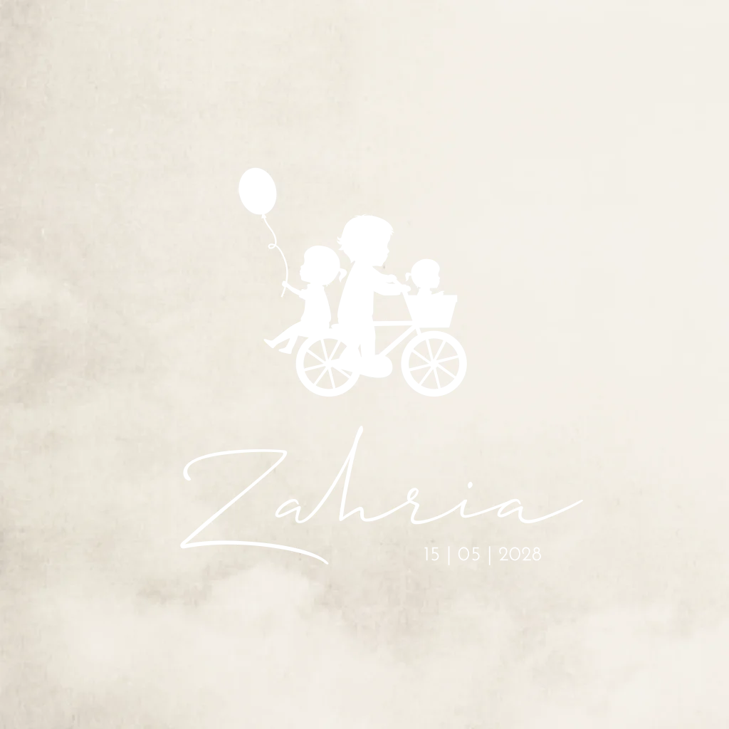 Een lief en romantisch geboortekaartje Zaria in een beige/ creme kleur met koperfolie voor de namen en de silhouetten van de kindjes. Wil je graag iets aanpassen? Neem dan een kijkje in onze editor voor de vele opties!