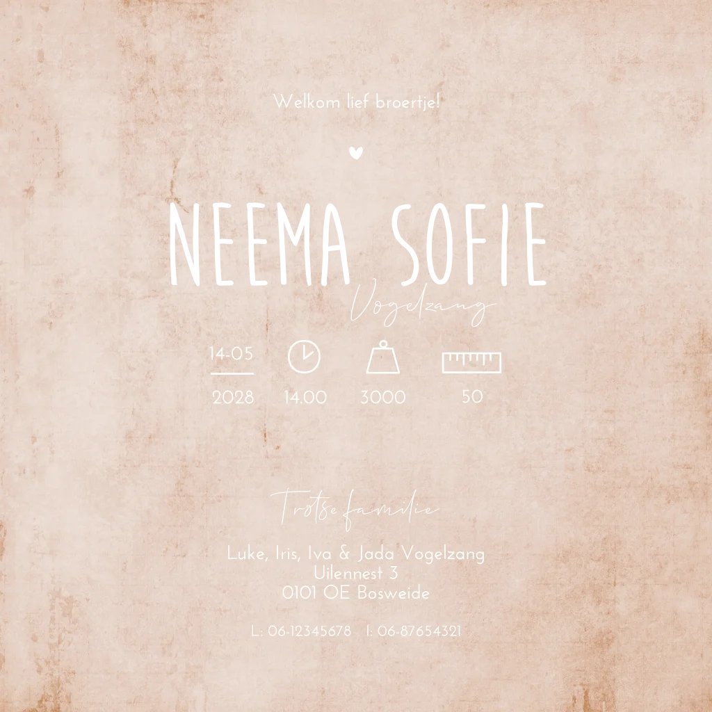 Een stoer hip en tijdloos trendy geboortekaartje Neema in een warme peach roze kleur met goudfolie voor de namen en de silhouetten van de kindjes. Wil je graag iets aanpassen? Neem dan een kijkje in onze editor voor de vele opties!
