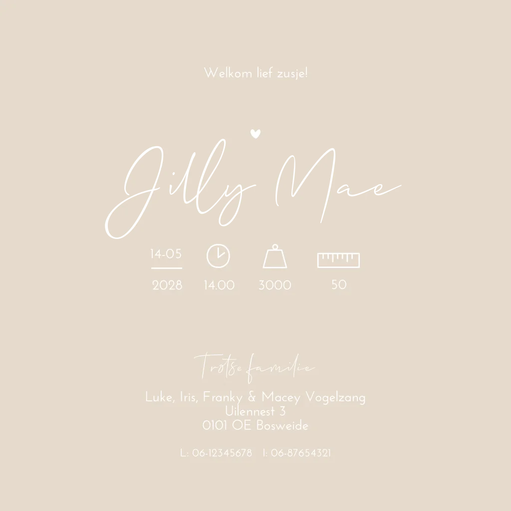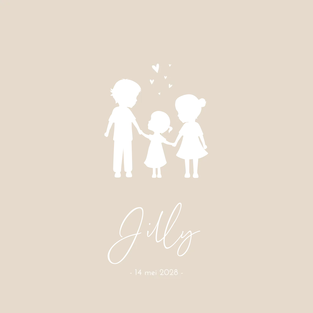 Een lief en romantisch geboortekaartje Jilly in een roze kleur met roséfolie voor de namen en de silhouetten van de kindjes. Wil je graag iets aanpassen? Neem dan een kijkje in onze editor voor de vele opties!