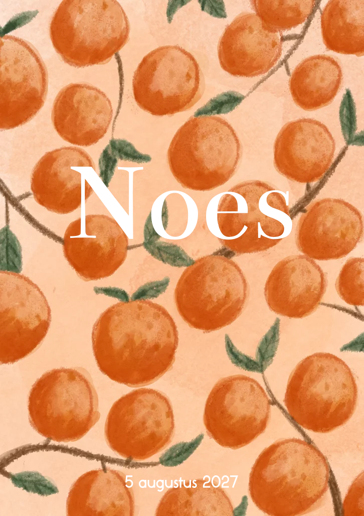 Een fruitig geboortekaartje met een illustratie van een patroon sinaasappel planten. Het goudfolie en de ronde hoeken zorgen er voor dat het geboortekaartje Noes een hippe uitstraling krijgt.