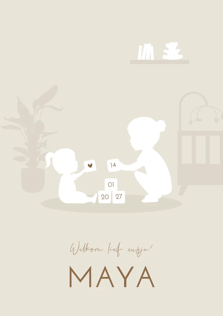Trendy en hip geboortekaartje met een beige achtergrond en een silhouet illustraties van twee zusjes die met blokken aan het spelen zijn. Ze zitten op de baby/kinderkamer. Je past geboortekaartje Maya volledig zelf aan in de editor.