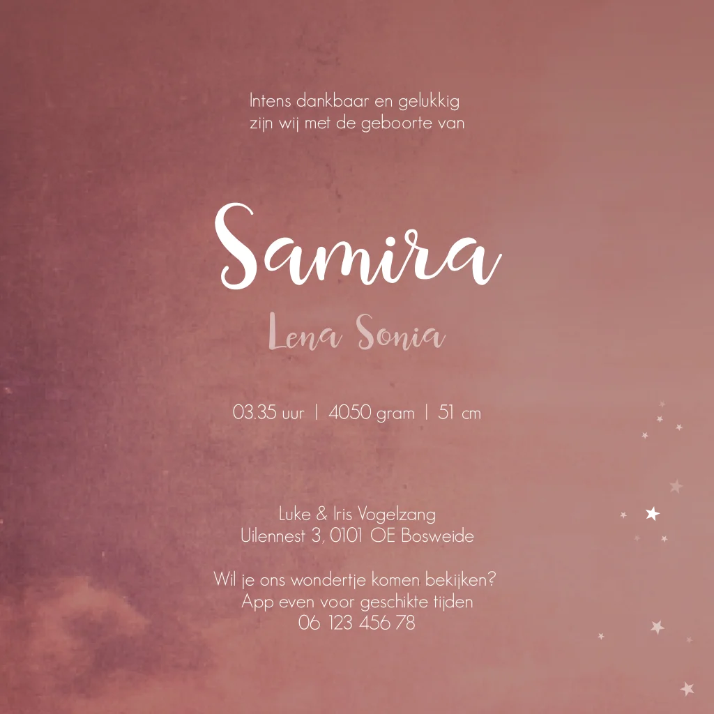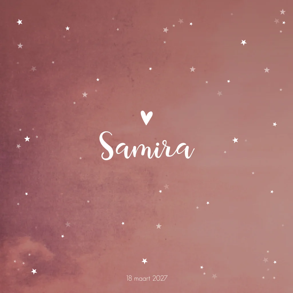 Een roestrood geboortekaartje vol met kleine sterren. Een speciaal kaartje voor een speciaal wonder. Kaartje Samira is prachtig wanneer je deze laat bedrukken met goudfolie. Zo glinsteren de sterren je tegemoet!