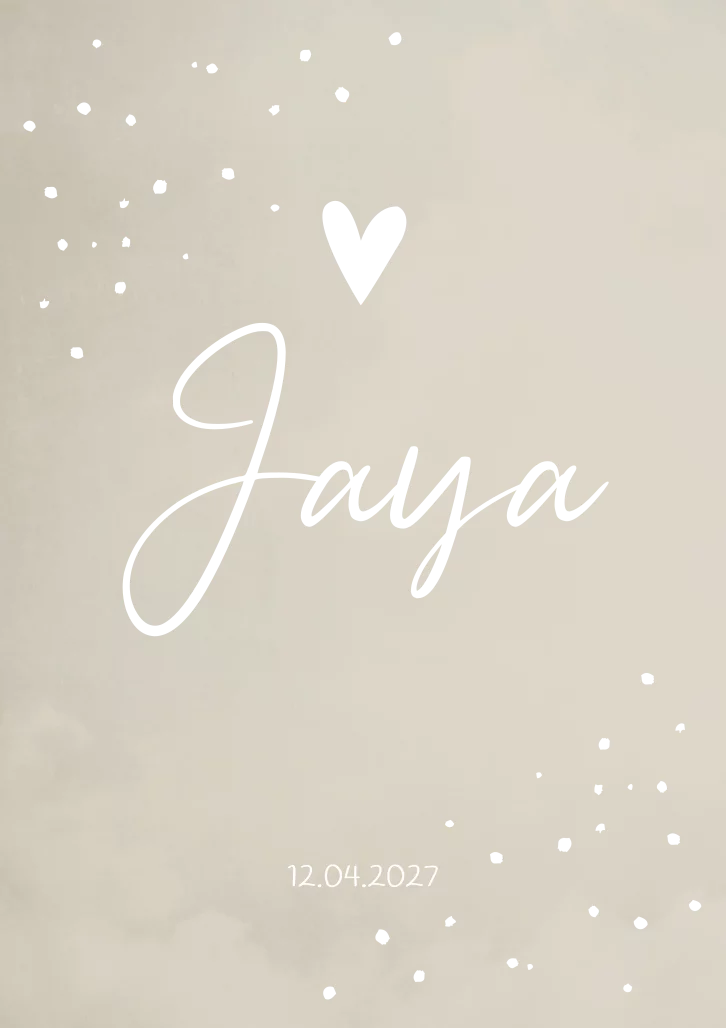 Een stijlvol beige/ crème geboortekaartje met hartjes en stipjes. Laat de gouden elementen van geboortekaartje Jaya bedrukken met goudfolie en de kaart zal je tegemoet glimmen. Wil je liever een andere achtergrondkleur? Neem dan een kijkje in onze editor voor alle opties.