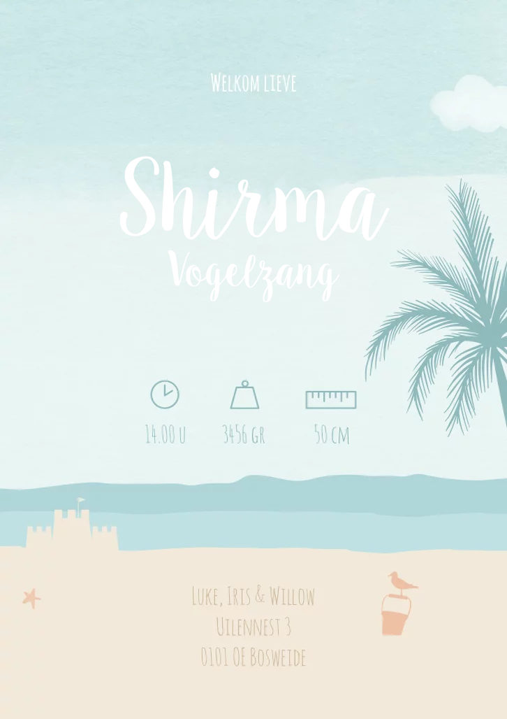 Bon bini Shirma! Dit geboortekaartjes is helemaal in zomerse sferen, met palmbomen, zee, strand en een zandkasteel. Super leuk als je graag op reis gaat naar zomerse landen of eilanden zoals Aruba, Bonaire of Curaçao. Je past dit geboortekaartje gemakkelijk aan in de editor.