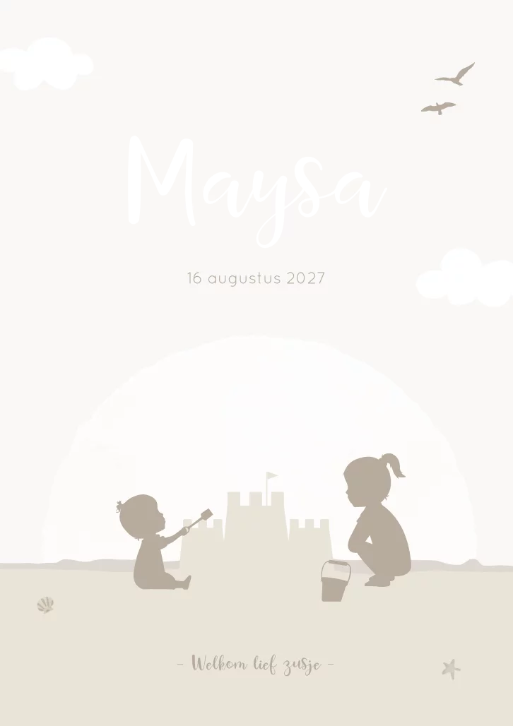 Een beige zomers geboortekaartje met koperfolie voor de naam. Op kaartje Maysa zie je twee zusjes spelend op het strand. Ze maken samen een zandkasteel. Wil je graag iets aanpassen? Neem dan snel een kijkje in onze editor want er is heel veel mogelijk om het kaartje helemaal naar wens te maken!