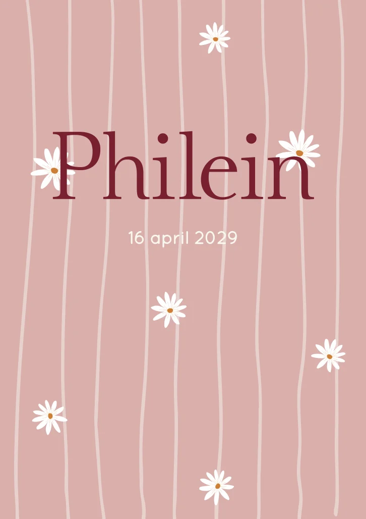 Lief en trendy geboortekaartje Philein met roze strepen en madeliefjes. Je kunt het geboortekaartje eenvoudig aanpassen qua kleur en opmaak. Bestel een proefdruk en bekijk het kaartje in het echt.