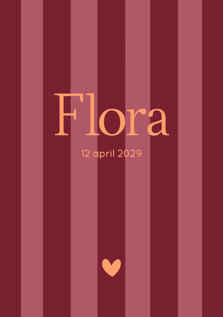Stoer en trendy geboortekaartje Flora met fel gekleurde strepen. Je kunt het geboortekaartje eenvoudig aanpassen qua kleur en opmaak. Bestel een proefdruk en bekijk het kaartje in het echt.