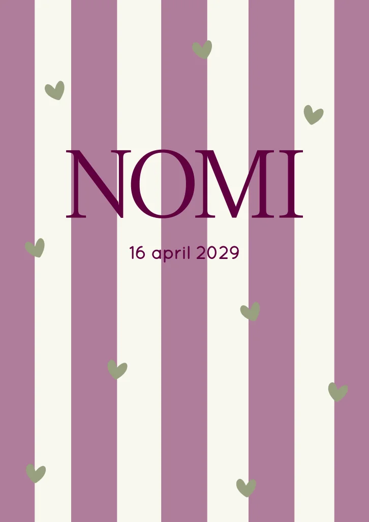 Lief en trendy geboortekaartje Nomi met roze strepen en groene hartjes. Je kunt het geboortekaartje eenvoudig aanpassen qua kleur en opmaak. Bestel een proefdruk en bekijk het kaartje in het echt.
