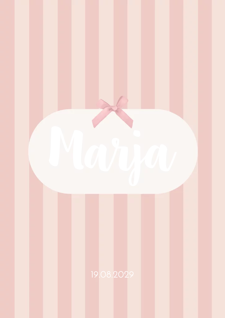 Een zacht roze gestreept geboortekaartje met roséfolie. kaart Marja bevat een strikje van rosé folie. Dit kun je aanpassen naar een ander icoontje of illustratie.