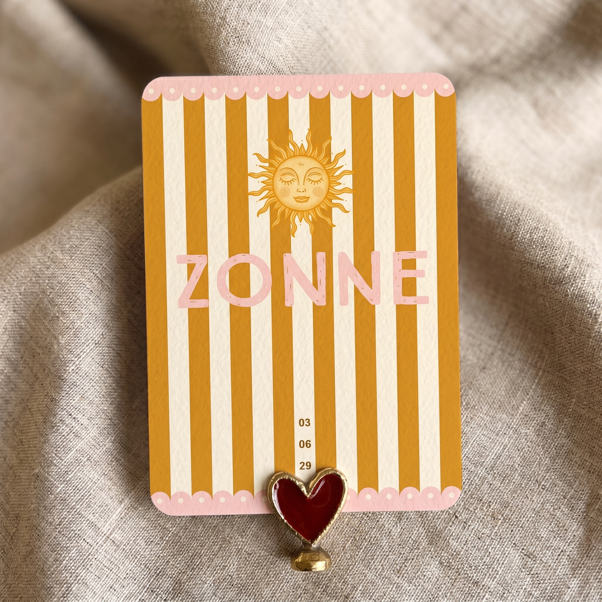 Geboortekaartje Zonne is een stralend kaartje! De afbeelding van de zon, de gele strepen en de roze boogjes zorgen ervoor dat het een feestelijk geboortekaartje is. De kleuren op de kaart kun je gemakkelijk naar wens aanpassen.