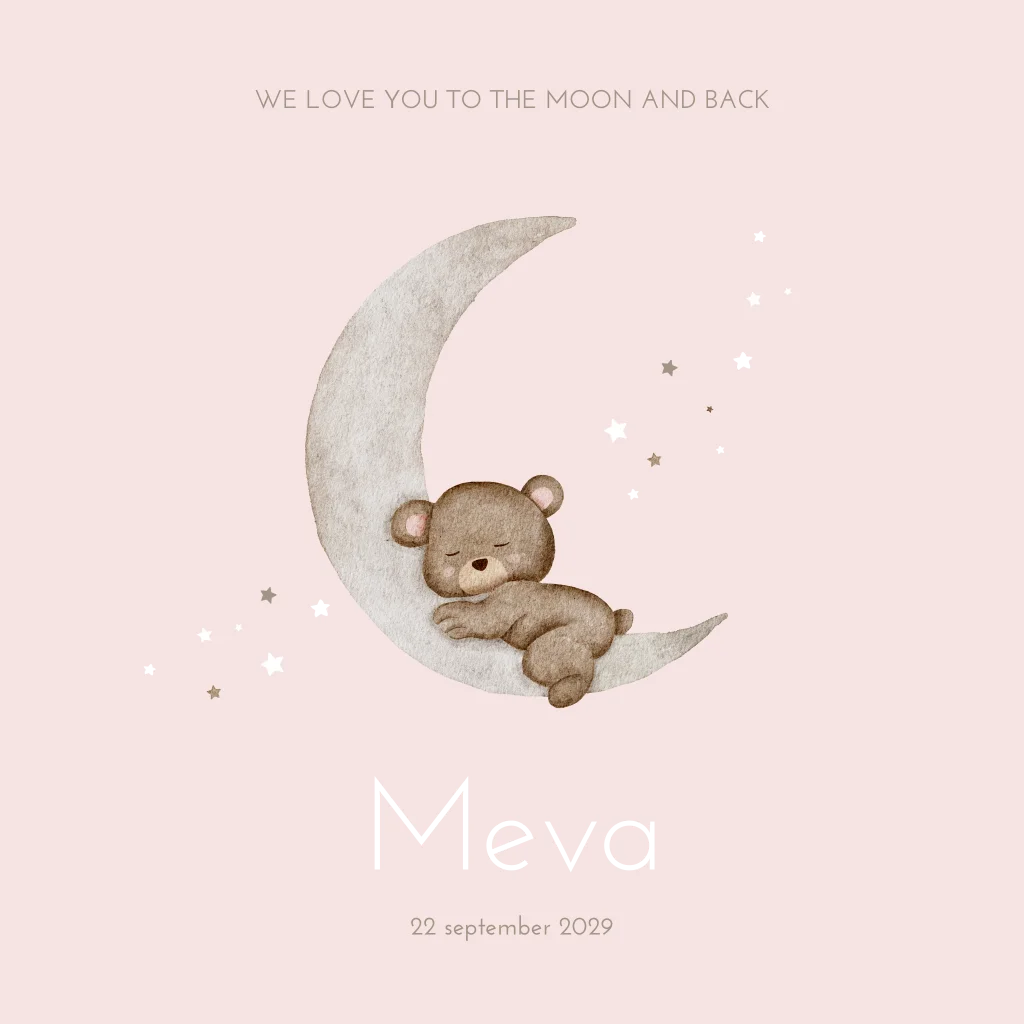Love you to the moon and back! Een zachte roze kleur met koperfolie geboortekaartje met een waterverf illustratie van een schattig slapend beertje op een maantje. Het beertje wordt omringd door kleine sterretjes en op de achtergrond zie je waterverfvlekken. Kaartje Meva is prachtig door de kleine koperfolie sterretjes. Wil je graag iets aanpassen, neem dan een kijkje in onze editor voor de vele opties!