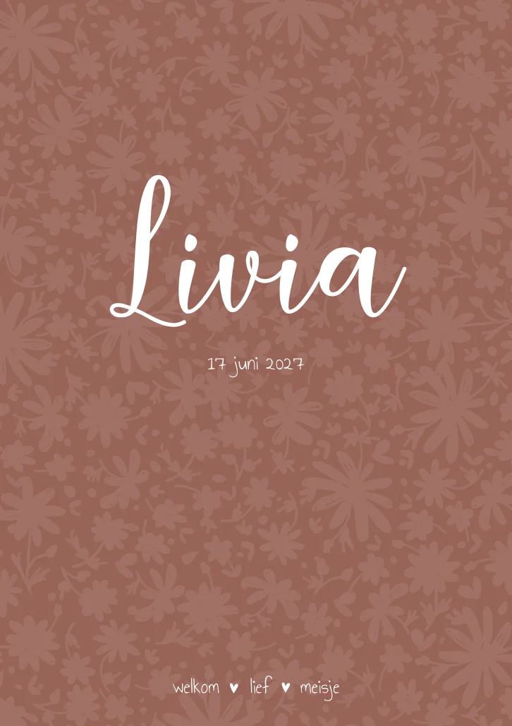 Een donkerroze/ terra kleur geboortekaartje met een bloemenpatroon. Kaartje Livia is een perfect lief en romantisch kaartje voor alle lente- of zomermeisjes!