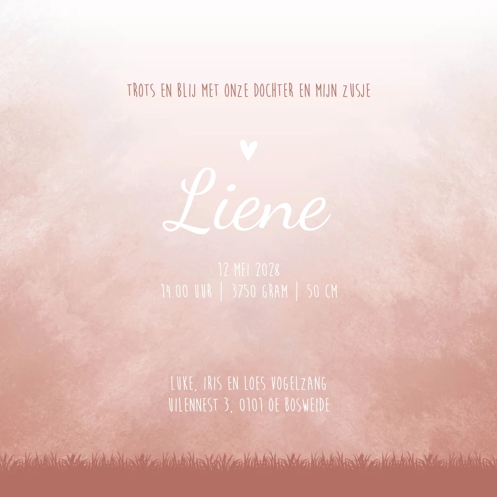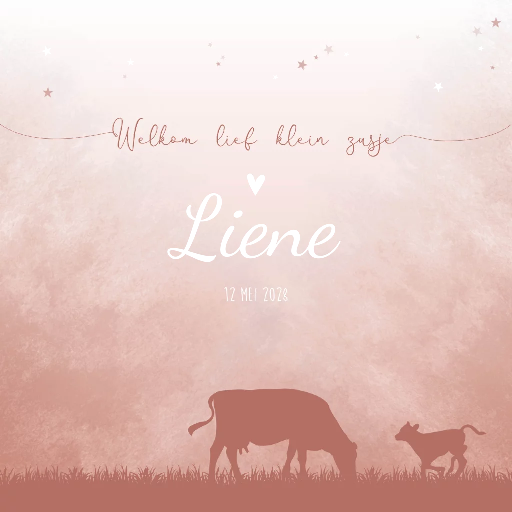 Een oudroze gevlekt geboortekaartje met een illustratie van een koe en een kalfje op de voorzijde. Op de kaart zijn ook de boerderij hond, grote zus op de trekker/ tractor met haar kleine zusje in een bakje er achter. Wil je graag kaartje Liene aanpassen naar jouw gezinssituatie? Pas dan gemakkelijk de kaart aan in onze editor.