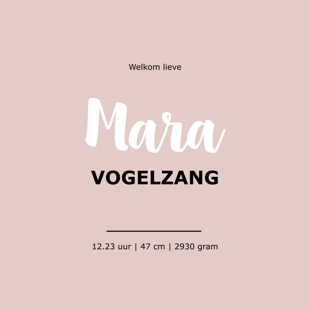 Een stoer geboortekaartje met roze en een witte letter. Door de zwarte letters wordt kaartje Mara extra stoer!