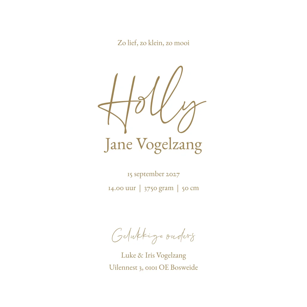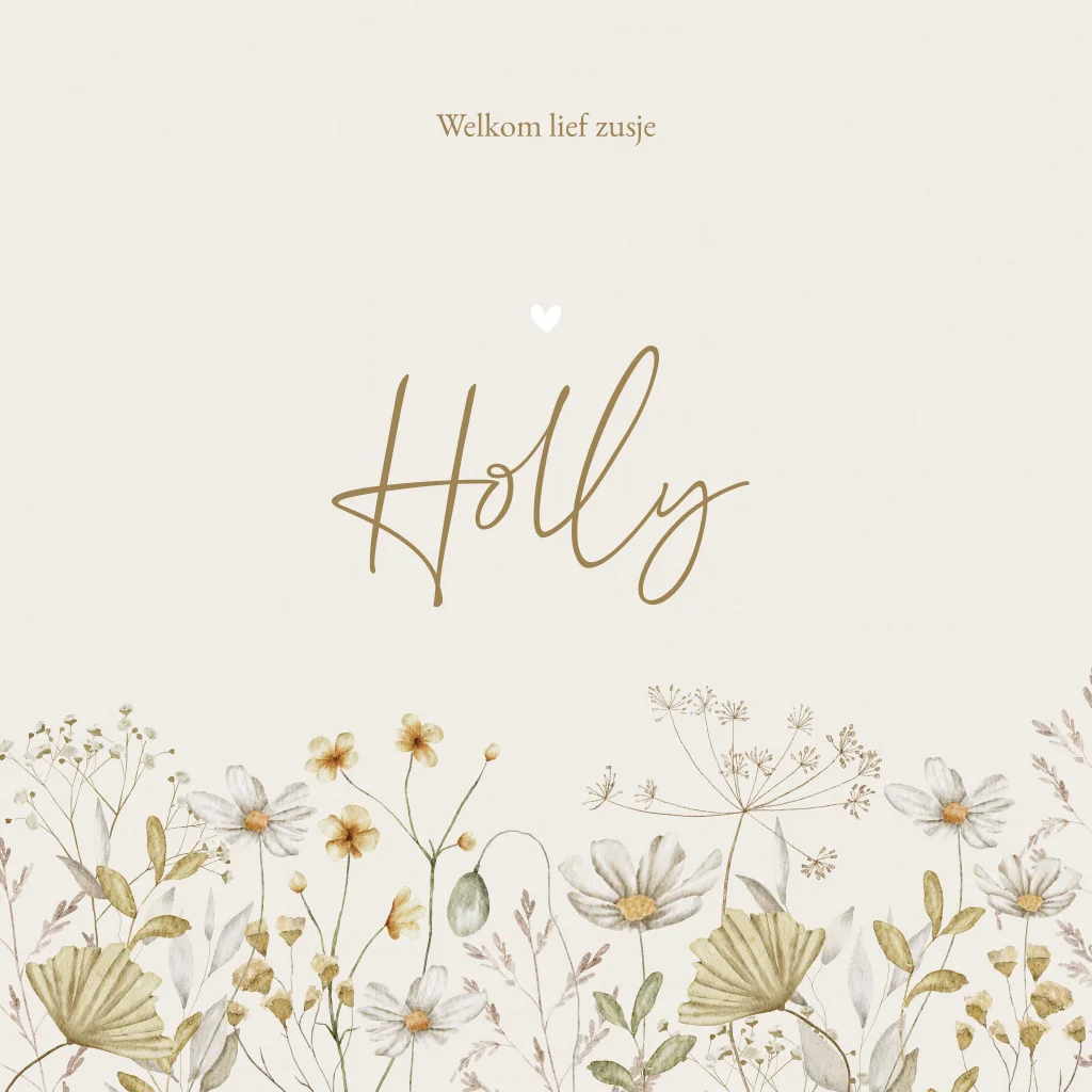 Een romantisch geboortekaartje met een waterverf/aquarel illustratie van verschillende veldbloemen. Op de achtergrond zit een heel licht linnen effect. Kaartje Holly heeft een rustige uitstraling door het gebruik van één kleurenfamilie en wordt door het gebruik van klassieke lettertypes een tijdloos ontwerp. Wil je graag iets aanpassen? Neem dan een kijkje in de editor voor de vele opties!