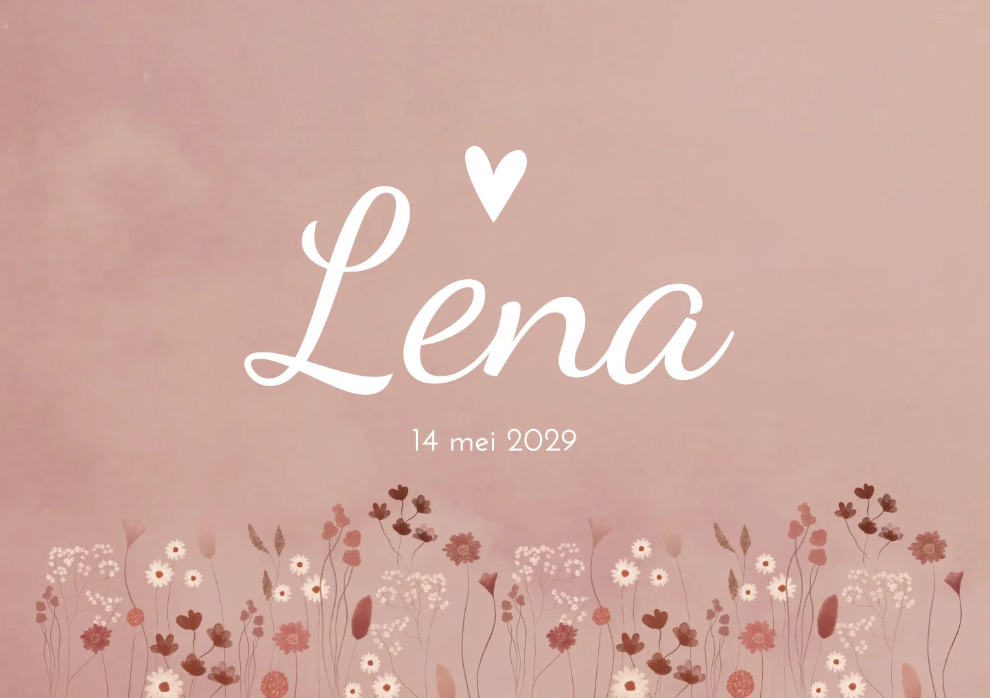 Een lief geboortekaartje met een getekend bloemenveld van droogbloemen. Kaartje Lena is door de roze kleur extra schattig. De hartjes zijn in roséfolie gezet, dit kun je makkelijk zelf aanpassen als je het liever in goudfolie of koperfolie wilt. Of wanneer je niet van folie houdt kun je de folie omzetten naar een roze kleur. Kom je er niet uit? App of mail ons dan, we helpen je zsm!