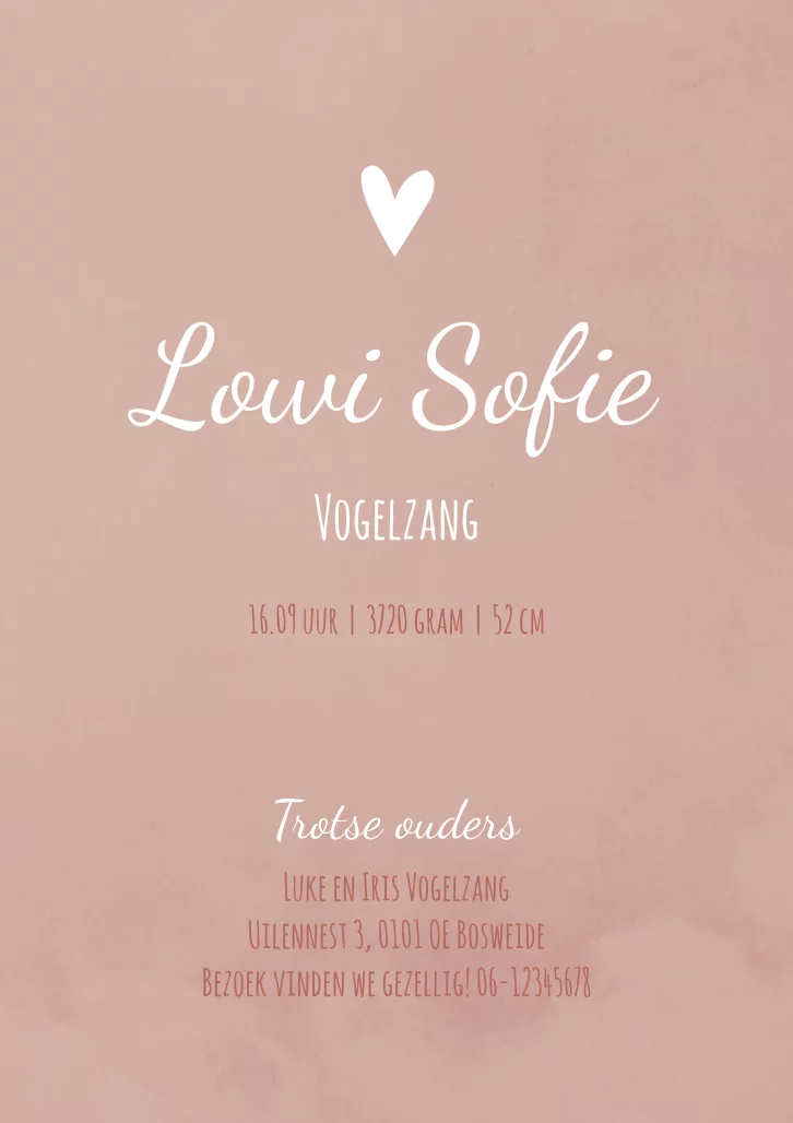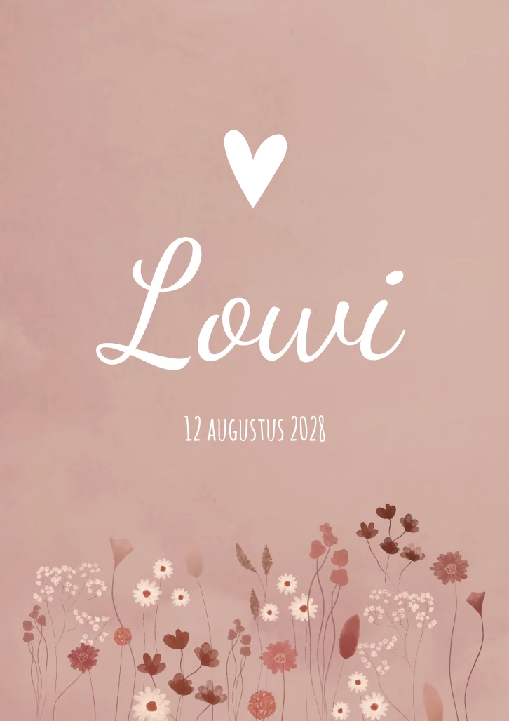 Een lief geboortekaartje met een getekend bloemenveld van droogbloemen. Kaartje Lowi is door de roze kleur extra schattig. De hartjes zijn in roséfolie gezet, dit kun je makkelijk zelf aanpassen als je het liever in goudfolie of koperfolie wilt. Of wanneer je niet van folie houdt kun je de folie omzetten naar een roze kleur. Kom je er niet uit? App of mail ons dan, we helpen je zsm!