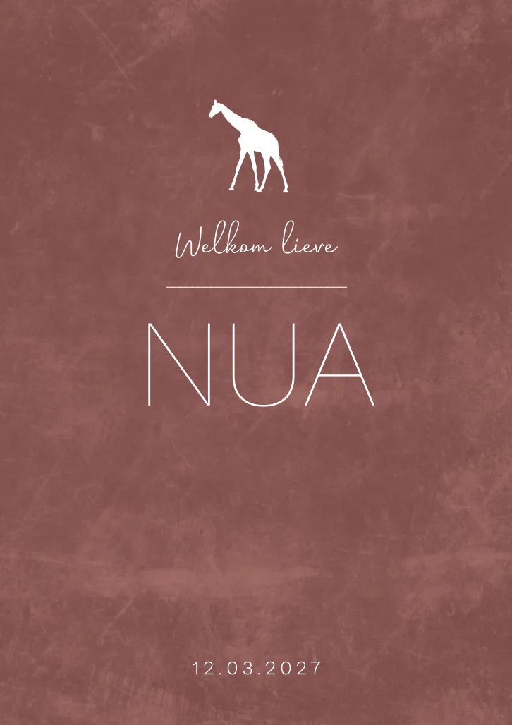 Trendy en eigentijds ontwerp geboortekaartje Nua in een warm bruin rode kleur met velvetlook. De goudfolie details maken het kaartje heel speciaal en luxe. De giraffe is aanpasbaar naar andere dieren of vormen. Je maakt het helemaal zelf in de editor!
