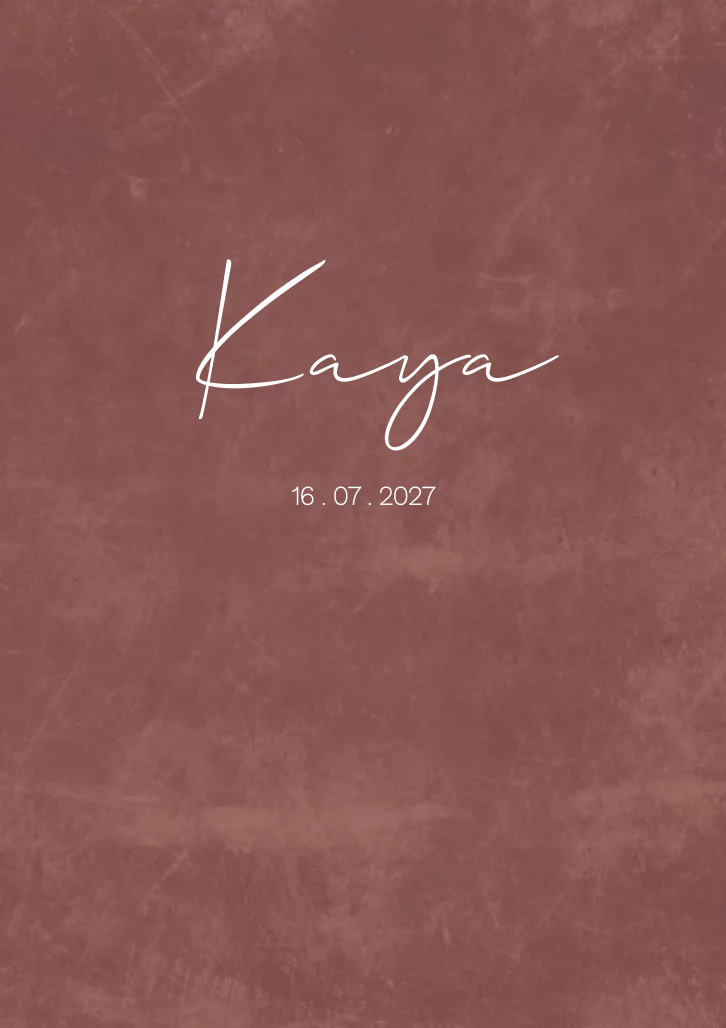 Tijdloos en eenvoudig modern ontwerp geboortekaartje Kaya in een bruin rode kleur met velvetlook. De goudfolie details maken het kaartje heel speciaal en luxe. Je kunt de kaart met je eigen gegevens opmaken in de editor!