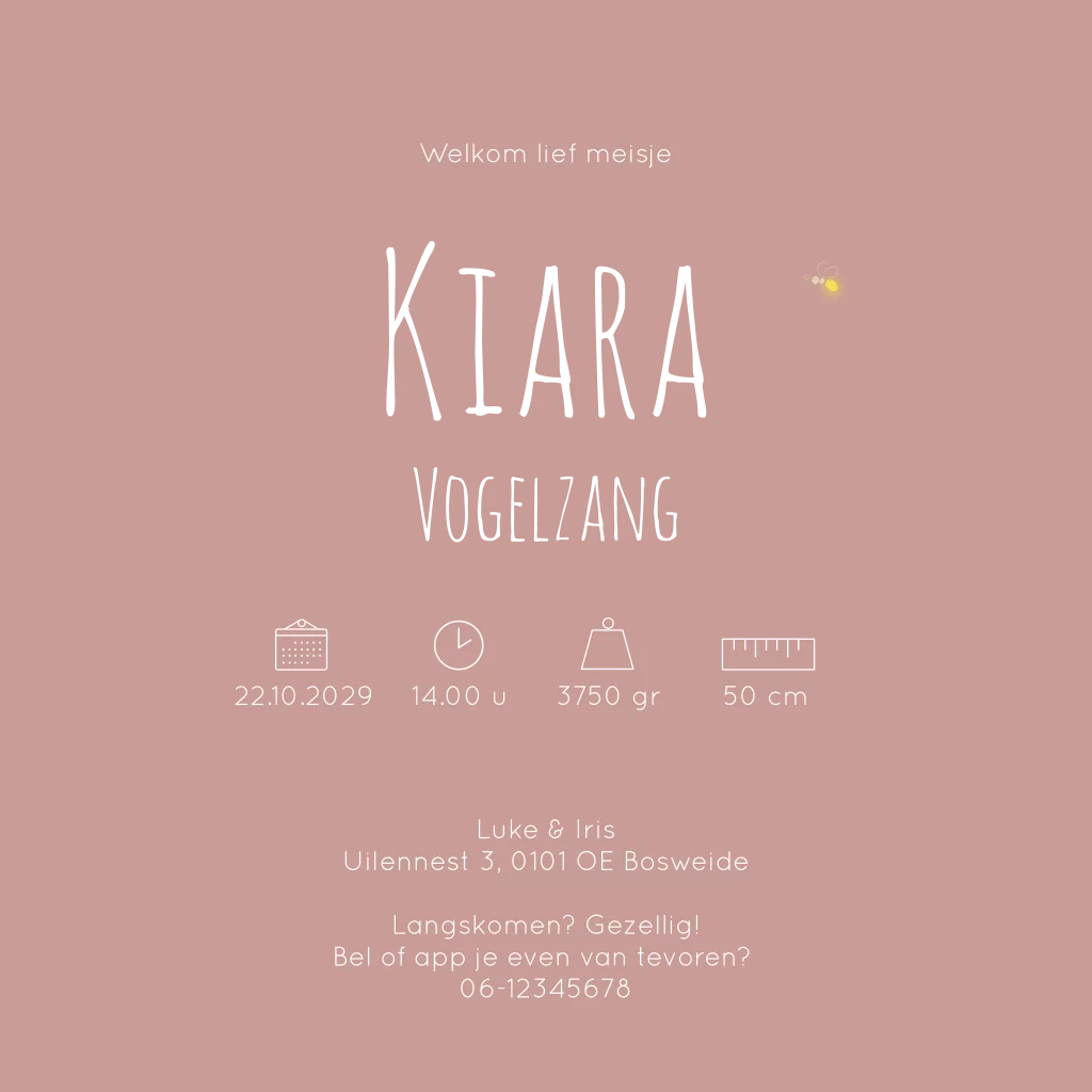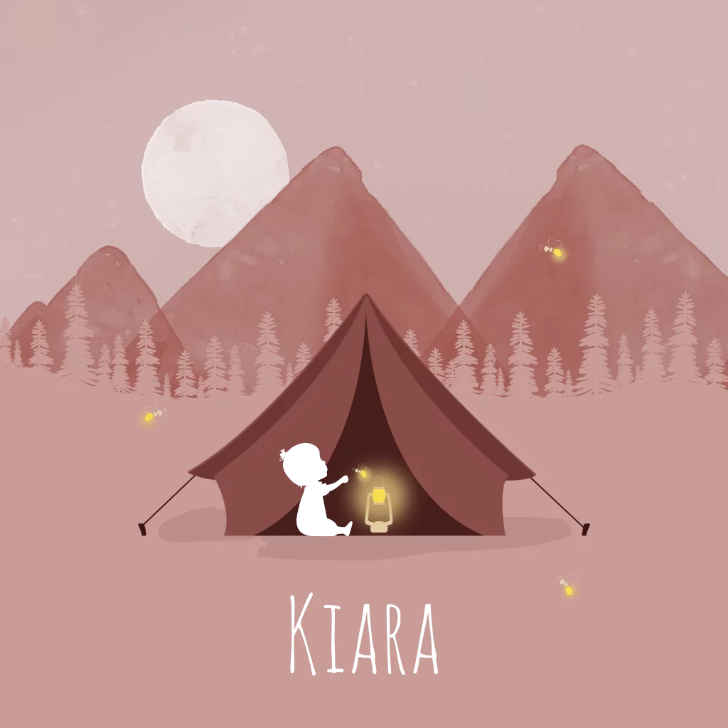 Een groen geboortekaartje met een silhouet van een meisje bij een tent. Het meisje op kaartje Kiara wijst naar een vuurvliegje. Op de achtergrond zie je bergen en een maan met sterren. Wil je graag iets aanpassen aan het kaartje? Neem dan een kijkje in onze editor voor de vele opties! Dit is een leuk ontwerp voor mensen die van kamperen als vakantie houden of er graag op uit trekken d.m.v. backpacken. Voor de ergste avonturiers en wereldreizigers.