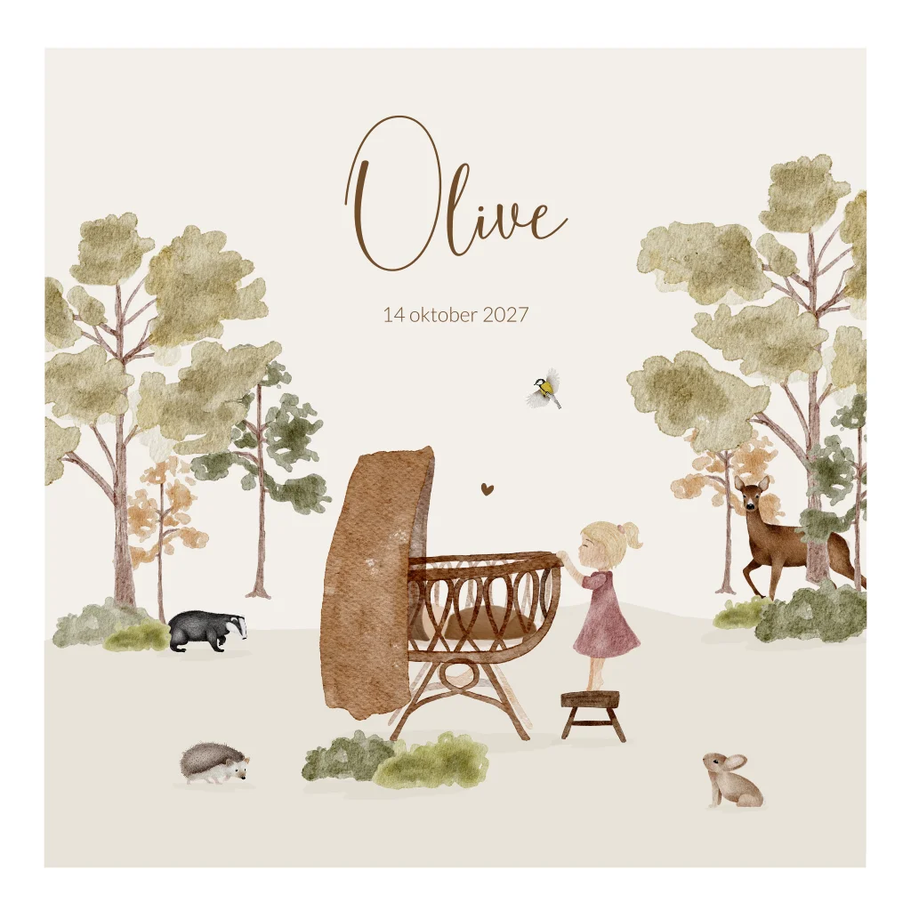Geboortekaartje in waterverf stijl met bosdieren en een zusje bij de wieg. Perfect voor de herfst. Beige neutrale achtergrond kleur. Geboortekaartje Olive is ontzettend mooi op gebobbeld papier.