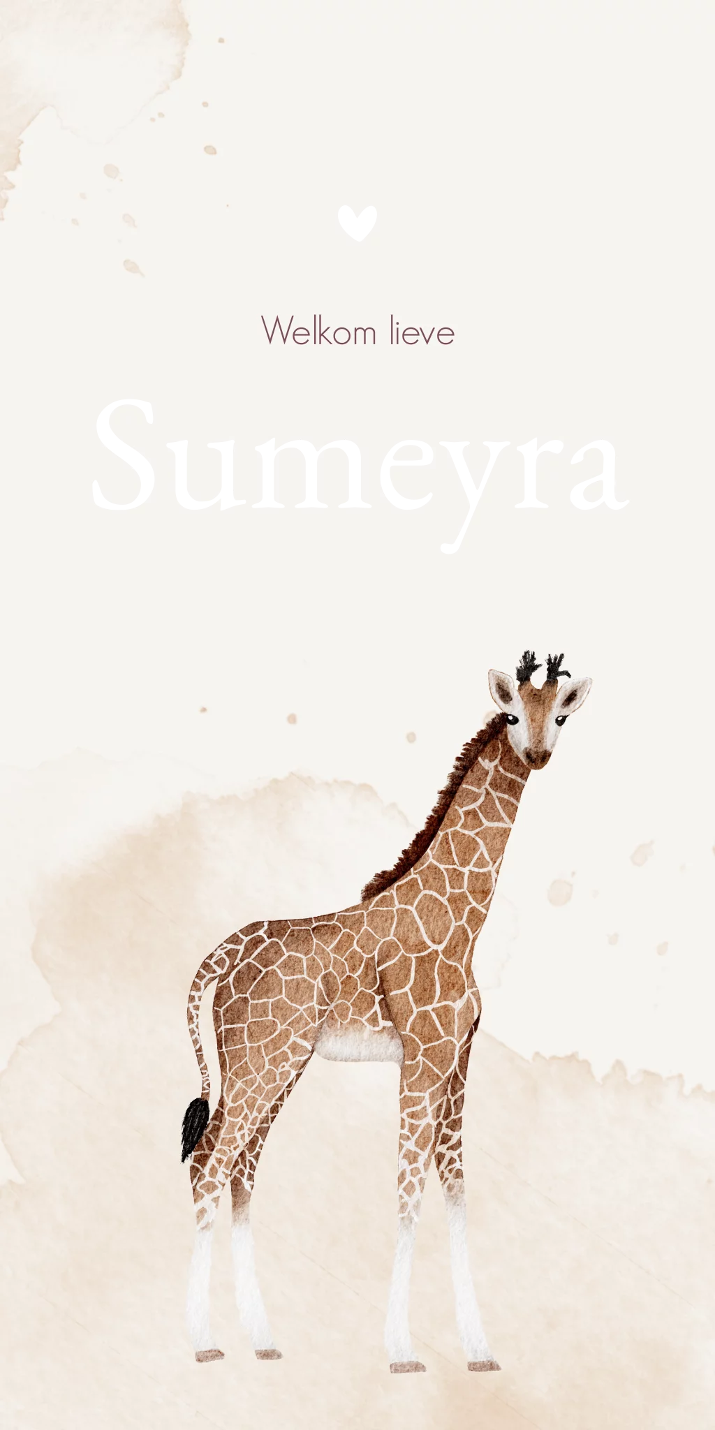 Een rustig beige/creme geboortekaartje met waterverf vlekken en een giraffe. Tip! Laat kaartje Sumeyra drukken op gebobbeld papier, dan lijkt de giraffe echt geschilderd. Wil je liever voor folie kiezen zoals dit voorbeeld, dan is roséfolie erg mooi.