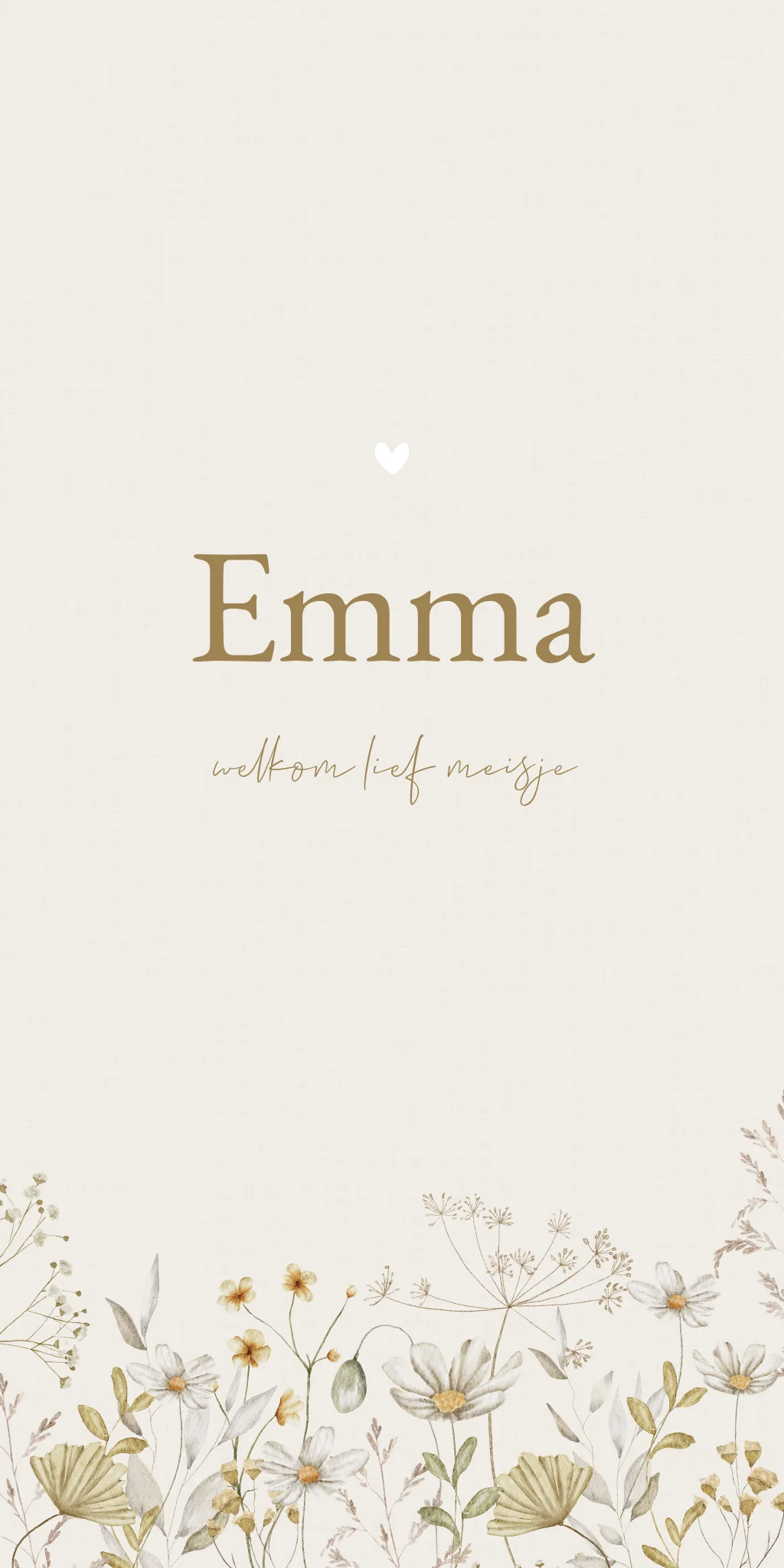 Een romantisch geboortekaartje met een waterverf/aquarel illustratie van verschillende veldbloemen. Op de achtergrond zit een heel licht linnen effect. Kaartje Emma heeft een rustige uitstraling door het gebruik van één kleurenfamilie en wordt door het gebruik van klassieke lettertypes een tijdloos ontwerp. Wil je graag iets aanpassen? Neem dan een kijkje in de editor voor de vele opties!