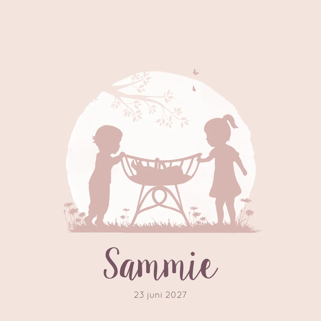 Een lief roze/paars geboortekaartje met een silhouet illustratie van een grote broer en zus die in het wiegje kijken. Kaartje Sammie kan je eenvoudig zelf aanpassen in onze editor!