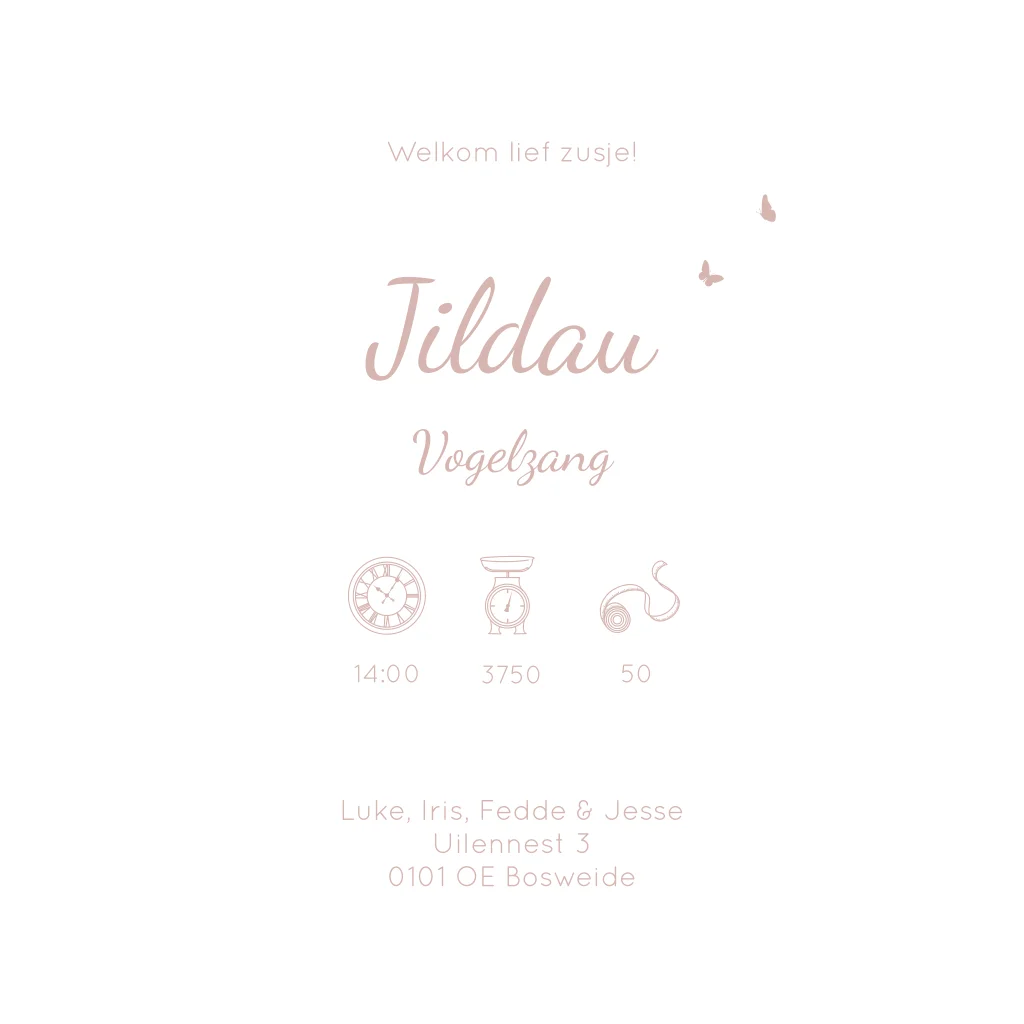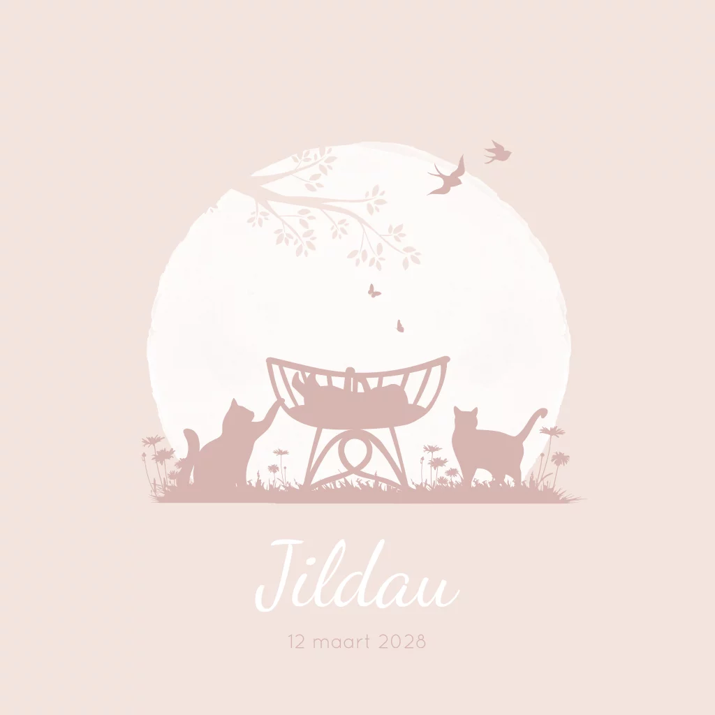 Een lief roze/paars geboortekaartje met een silhouet illustratie van een kat en een poes die in het wiegje kijken. Er vliegen vlinders en vogels bij de boom. En er staan bloemetjes bij het babybedje. Kaartje Jildau kan je eenvoudig zelf aanpassen in onze editor!