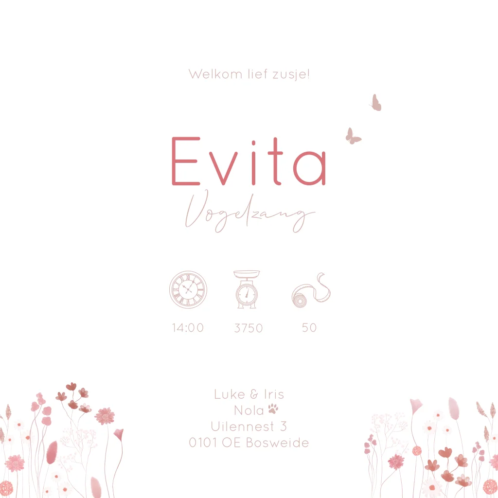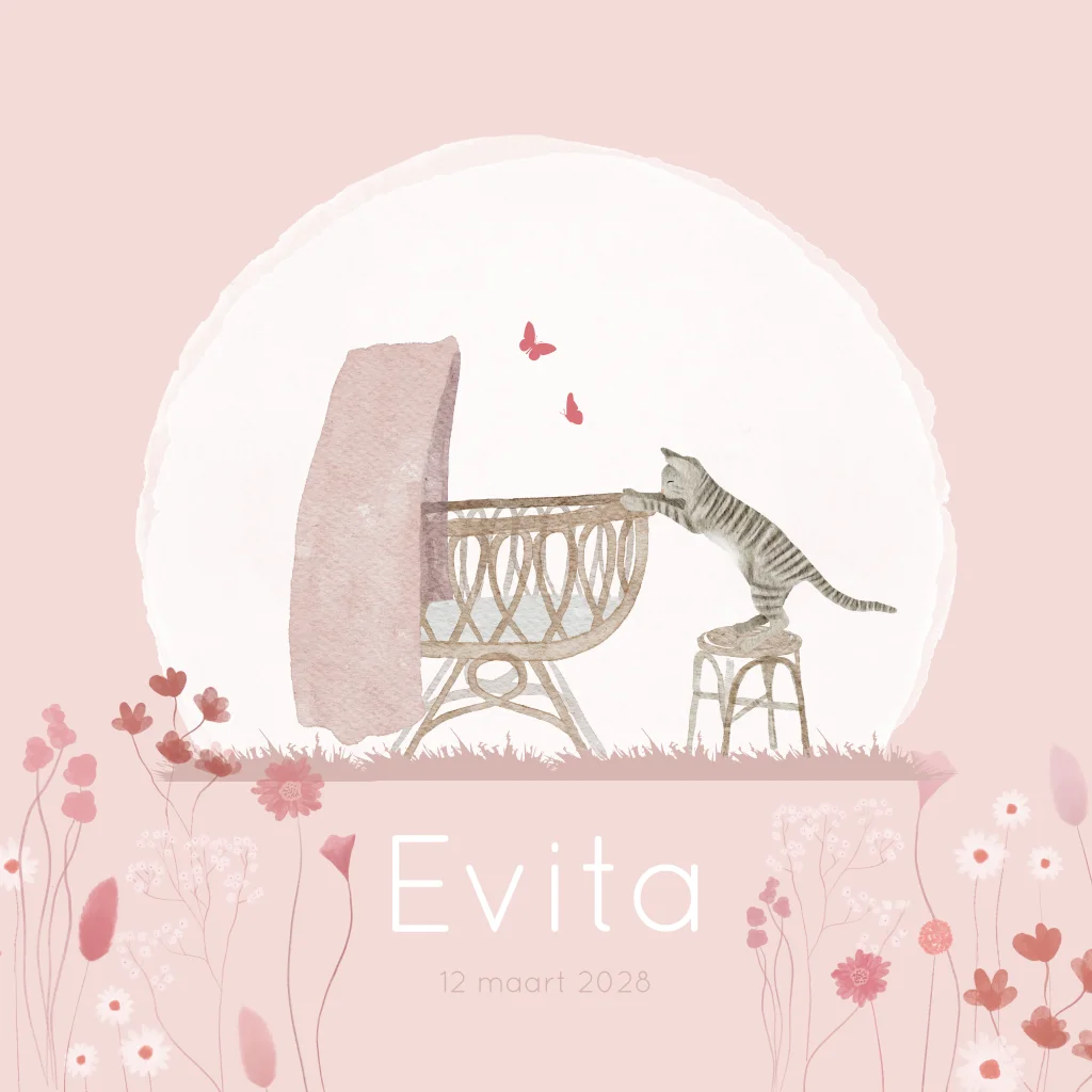 Een lief roze bloemetjes geboortekaartje met een waterverf illustratie van een poesje/kat van een kat die met zijn pootjes over het randje van de wieg kijkt om de baby te zien.. Er vliegen vlinders boven het wiegje. Kaartje Evita kan je eenvoudig zelf aanpassen in onze editor!