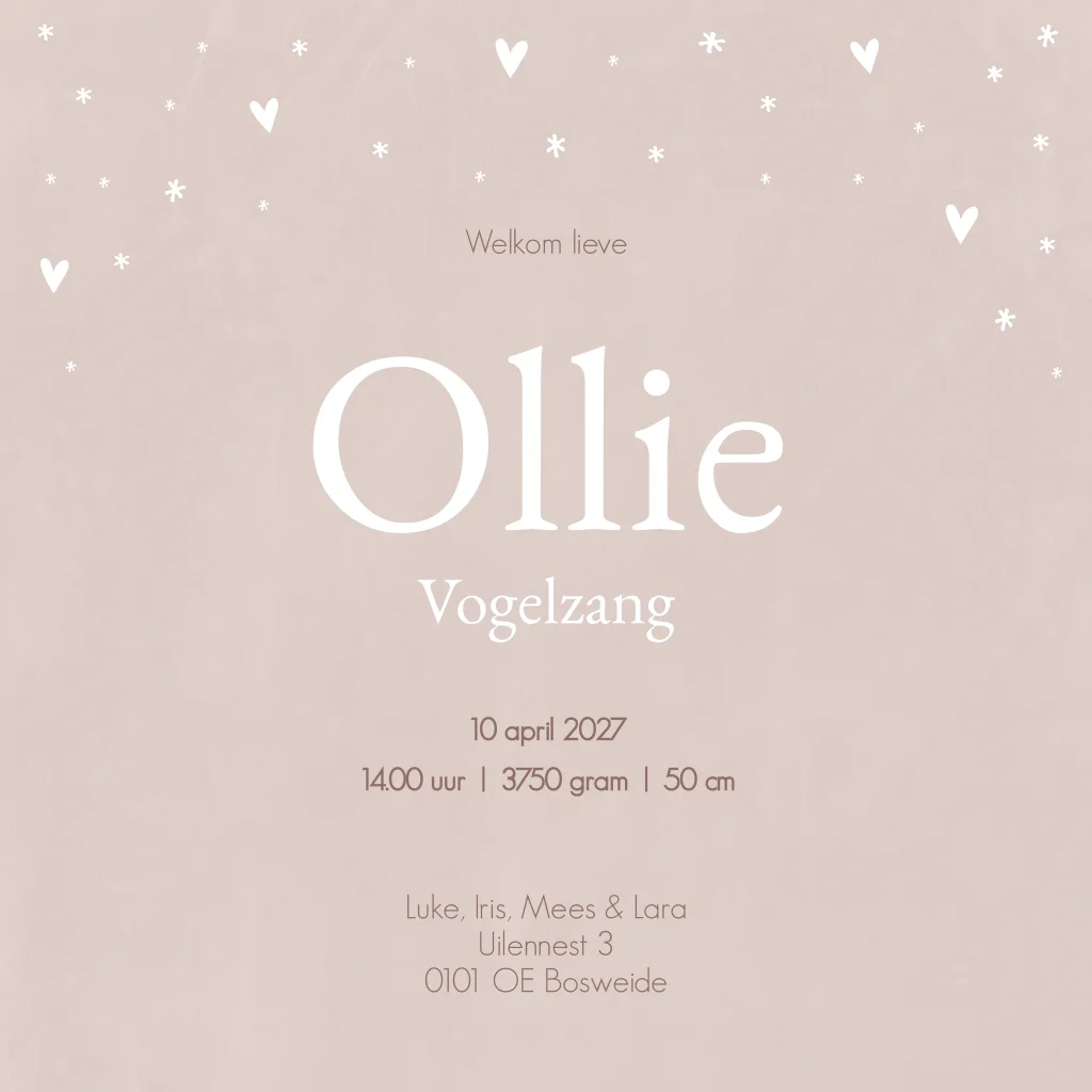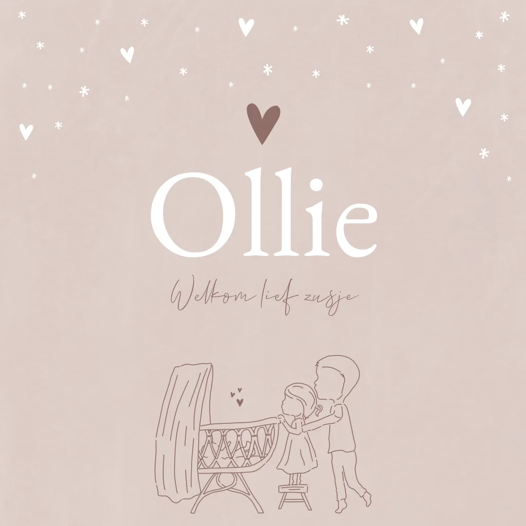 Een romantisch lief oudroze geboortekaartje met een lijntekening van een grote broer en zus die in het wiegje kijken. Kaartje Ollie is een lief en klassiek kaartje. Wil je liever een andere illustratie? Neem dan een kijkje voor al onze opties in de editor!